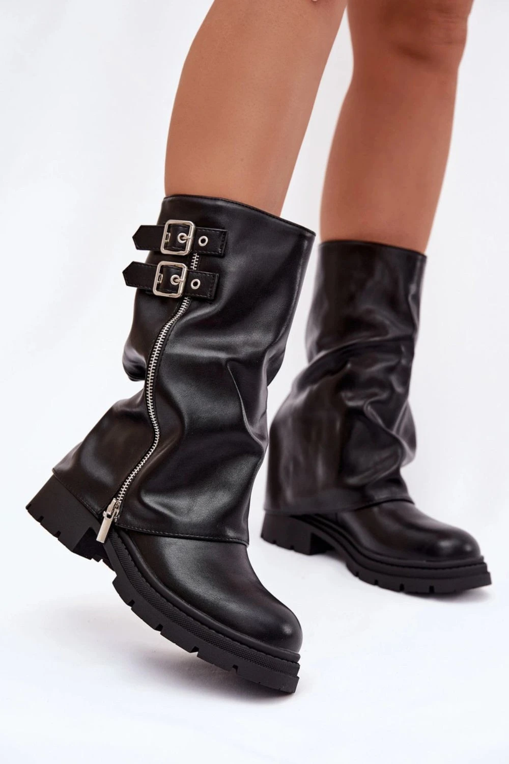 Dámské boty vyrobené z ekokože jsou praktickým a stylovým návrhem na chladné dny. Vyšívaný interiér poskytuje teple a pohodlí v mrazivých dnech. Model je jak nastrčený, tak zapínán na zip, co usnadňuje oblékání. Další stříbrný zip slouží jako dekorativní prvek, zdůrazňující moderní charakter obuvi. Zaoblené špičky jim dodávají klasický vzhled, a dvě spony s krátkými pásky představují módní, výrazný akcent. Ideální pro každodenní podzimní a zimní stylizace.