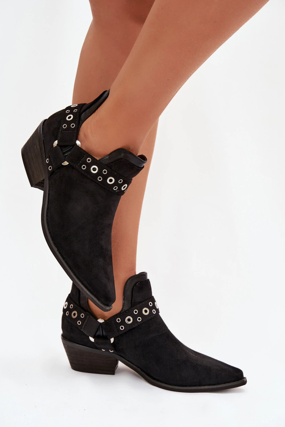 Elegantní dámské kotníkové boty vyrobené z ekologického semiše. Umístěné na nízkém, řezaném podpatku zajistí stabilitu a pohodlí při nošení, zatímco špičaté špičky opticky zjemňují nohu. Střih zdobenými popruhy a efektními výřezy dodává módní, originální charakter. Posuvný model usnadňuje rychlé obutí, díky čemuž se boty skvěle hodí jak do každodenních, tak do elegantnějších stylizací.