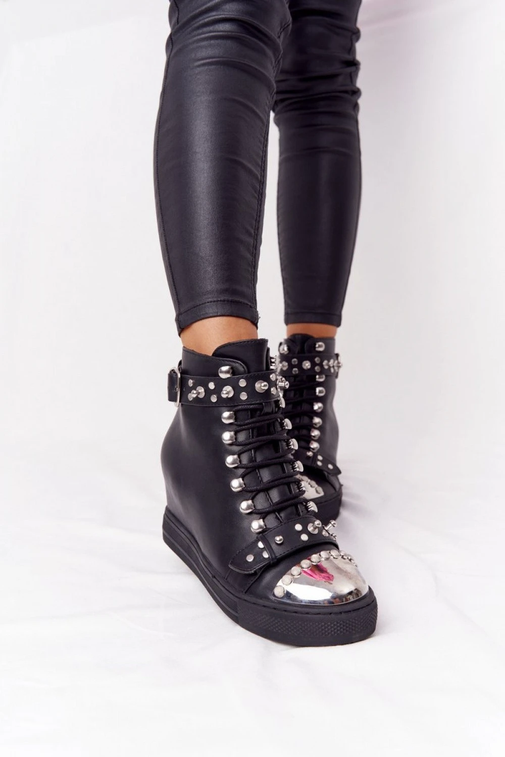 Jedinečné boty na platformách s kamínky a přezkami. Boty jsou vyrobeny z ekokůže a mají izolační dečku na boty. Boty se budou skvěle hodit ke glam rockové nebo grungeové stylizaci. Nezapomeňte si prohlédnout celou naši kolekci dámských kozaček!