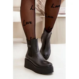 Dámské kotníkové boty vyrobené z přírodní kůže jsou stylovým návrhem na chladnější dny. Umístěné na masivní platformě s klínem poskytují pohodlí a stabilitu. Zip umístěný na boku šlupky usnadňuje obouvání a vyztužená patka dodává botům odolnost a podporu. Vnitřek vyplněný filcem zaručuje teplý pocit a ozdobný prvek na šlupce zdůrazňuje jejich jedinečný charakter. Tento model bude skvělým doplňkem různých stylizací.