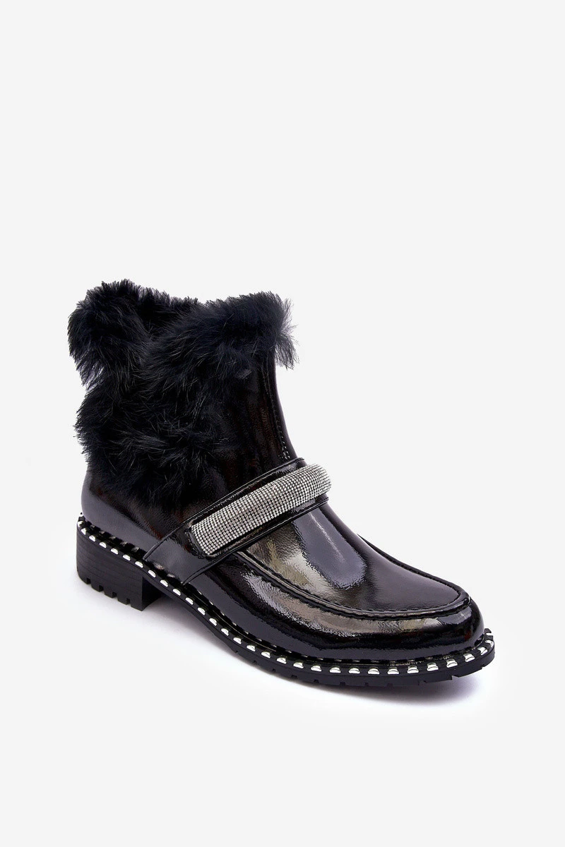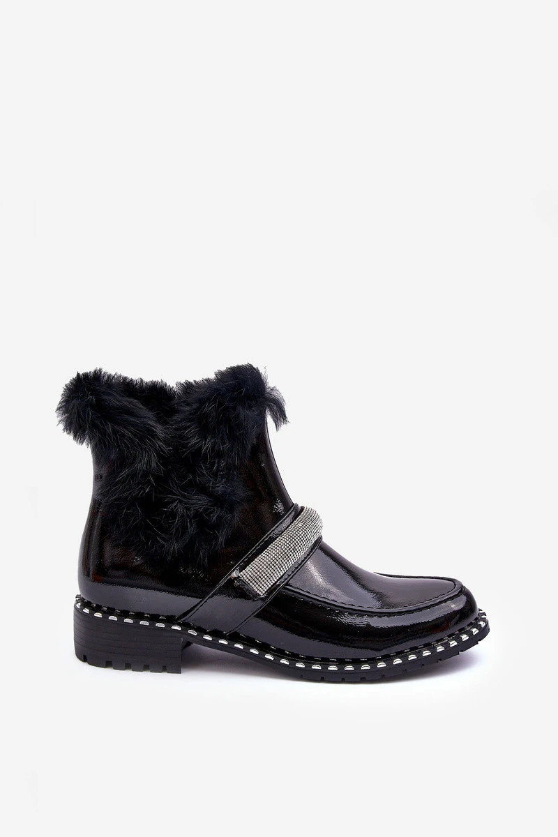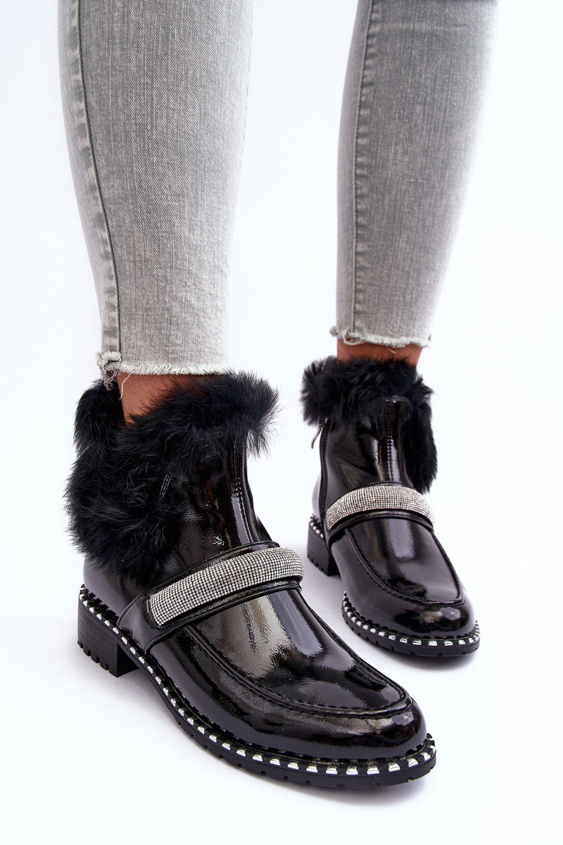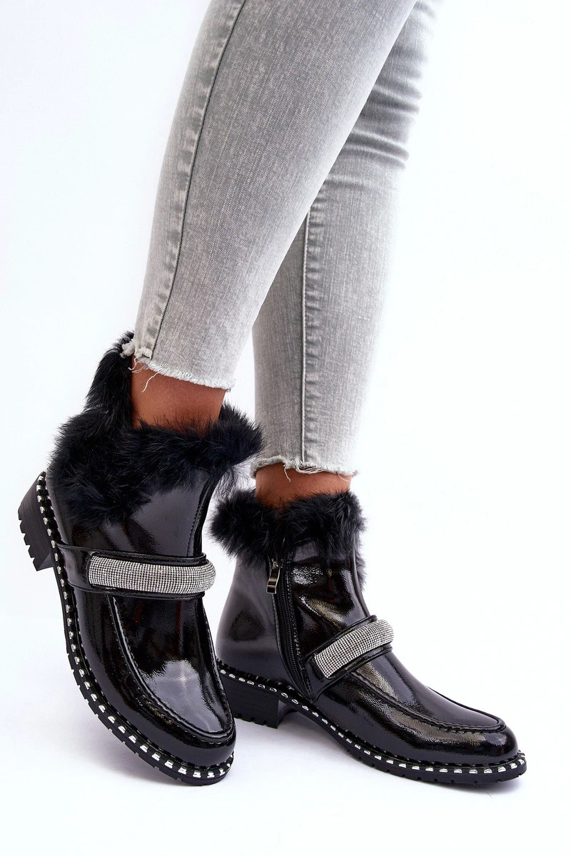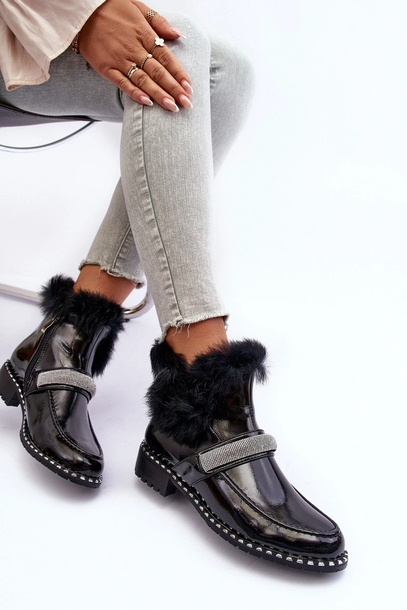 Boty ženy s nízkou přilbou byly vyrobeny z eko kůže. Osazené na plochém podpatku, který poskytne stabilitu při každém kroku. Tento model je ozdoben kožešinou a páskem s malými, početnými džetami. Střed oceněný obuvnickou tepelnou vložkou. Upevnění na zip. Měkká vložka zajišťuje pohodlí při používání. Navíc je špička zesílena. Při výběru velikosti se řiďte tabulkou velikostí.