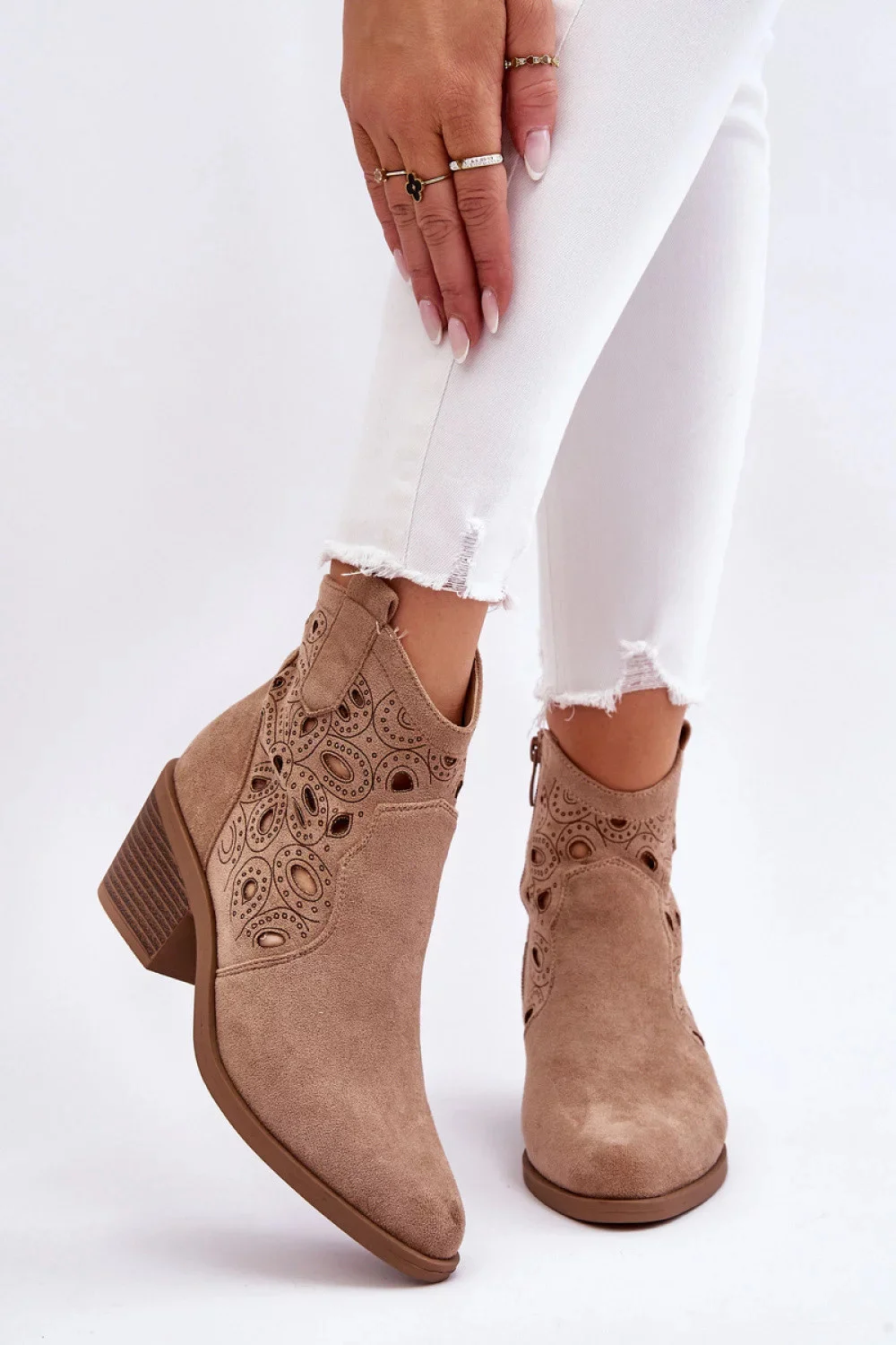 Kovbojské boty na masivním sloupu zajišťují stabilitu při používání. Zapínají se po stranách na zip. Mají zpevněnou patu. Vyrobeny z ekokože v moderním, prodyšném vzoru. Botky v kovbojském stylu budou skvělým doplňkem mnoha stylizací. Můžete je nosit například s košilí, lehkými sukněmi nebo džínovými kalhotami.