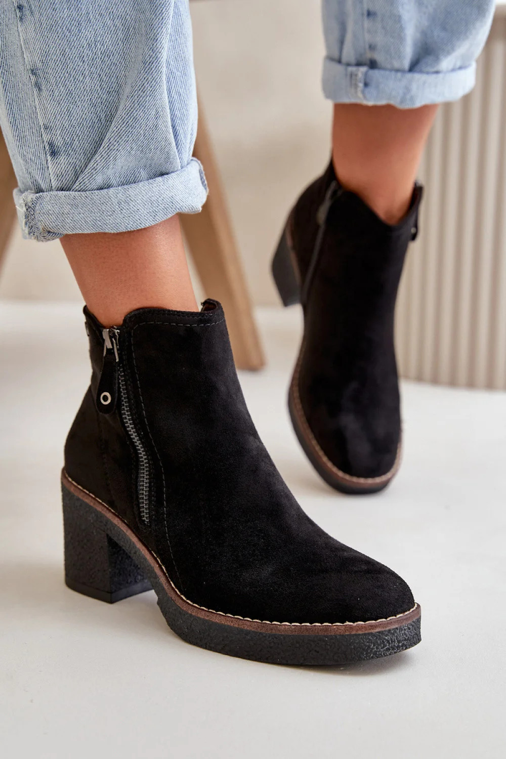 Dámské kotníčkové boty vyrobené z měkkého ekologického semiše. Umístěné na stabilní podpatku. Vnitřek je vyplněn obuvnickým kožíškem, co zajišťuje teplo a pohodlí při nošení. Tento model má zaoblené špičky a je zapínán na zip, co usnadňuje oblékání a svlékání. Ideální pro podzimní a zimní stylizace.