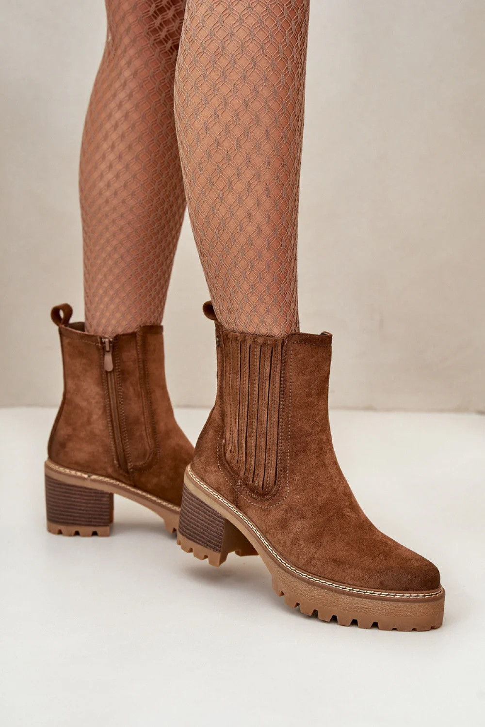 Dámské botky vyrobené z ekologického semiše. Umístěné na stabilním sloupovém podpatku. Vnitřek je vyplněn obuvnickým polštářem, který zajišťuje teplo a pohodlí nošení. Tento model se zapíná na zip, co usnadňuje obouvání a vyzouvání. Zaoblené špičky. Ideální pro podzimní a zimní styly.