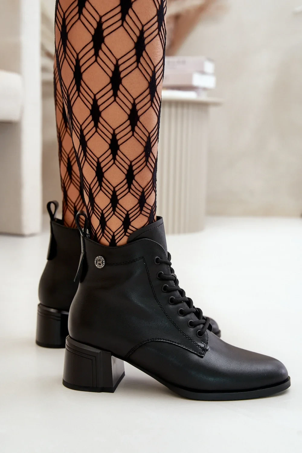 Dámské botky značky Vinceza. Vyrobeny z přírodní kůže. Umístěny na stabilní podpatku. Model se šněrováním a s dalším zipem. Zaoblené špičky. Vnitřek je vyložen kožešinou. Po stranách botky se nachází ozdobný malý detail.