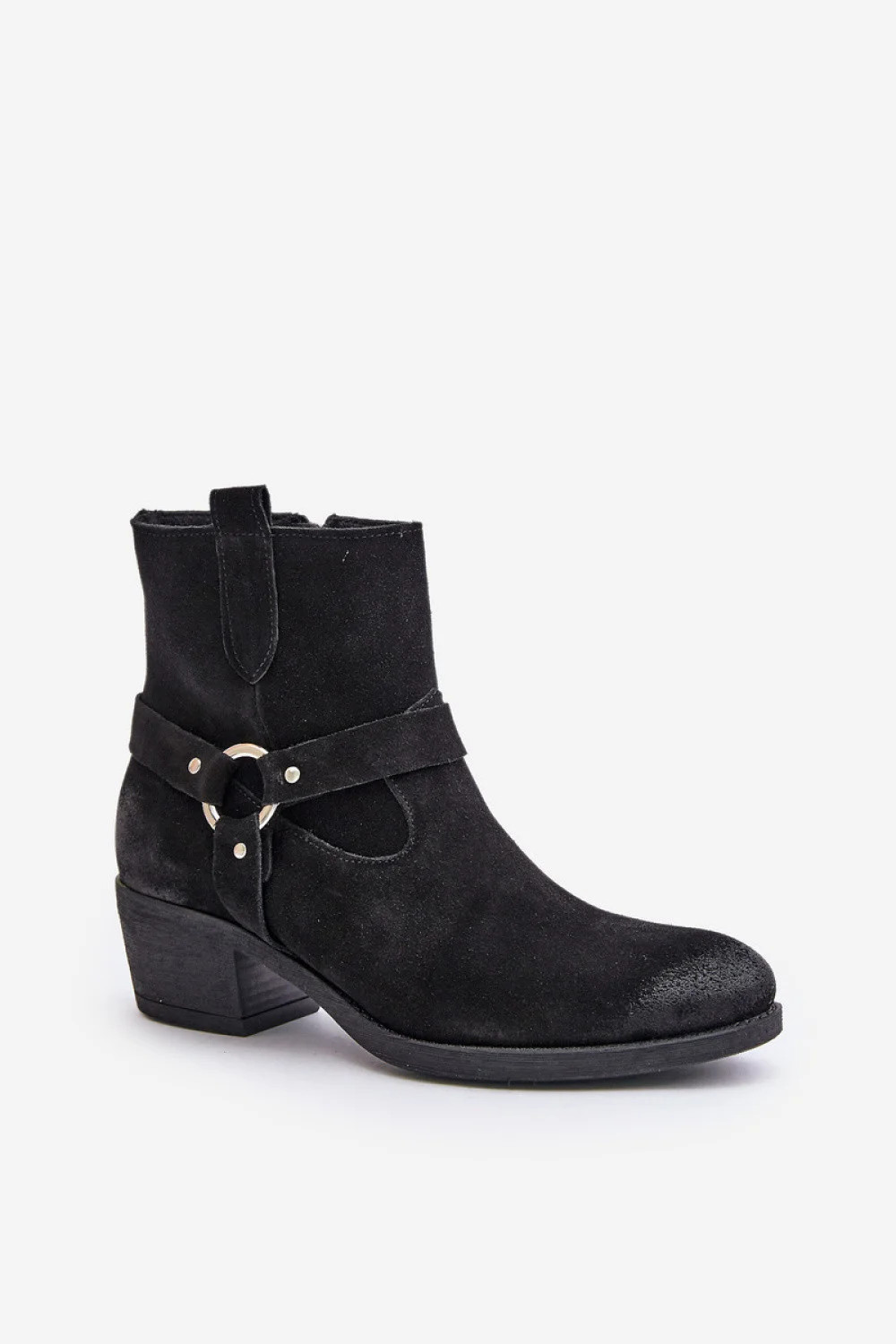 Dámské boty z přírodního semiše. Stojí na nízkém podpatku. Mandlový tvar špičky. Uvnitř plsť, která udrží teplo v chladnějších dnech. Zapínání na zip. Pruhy na svršku. Tento model se bude skvěle hodit ke kalhotám i šatům.