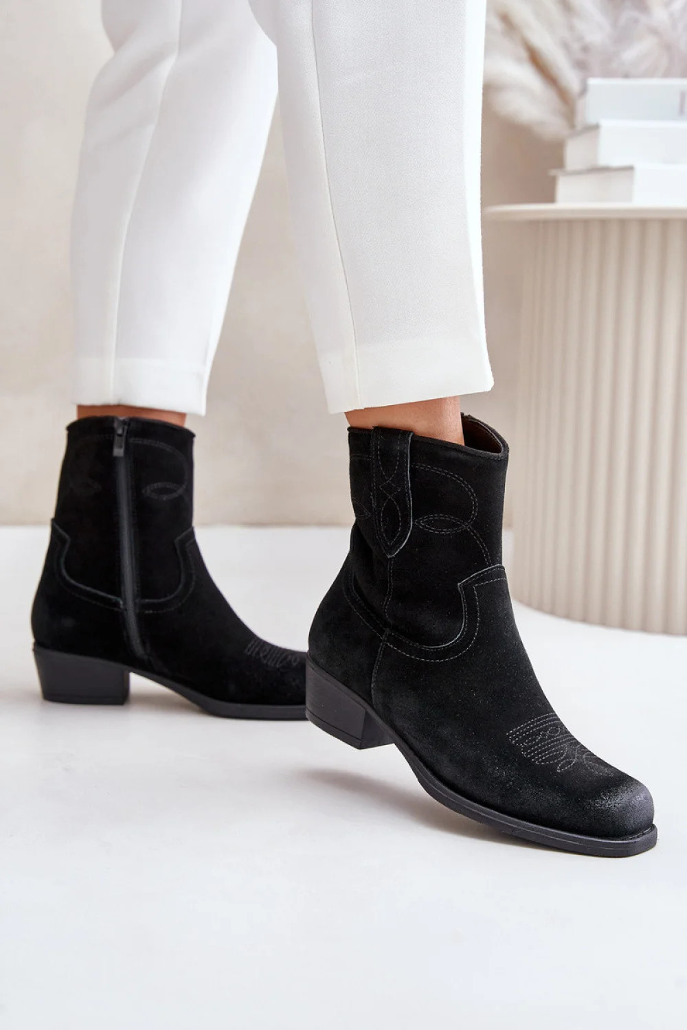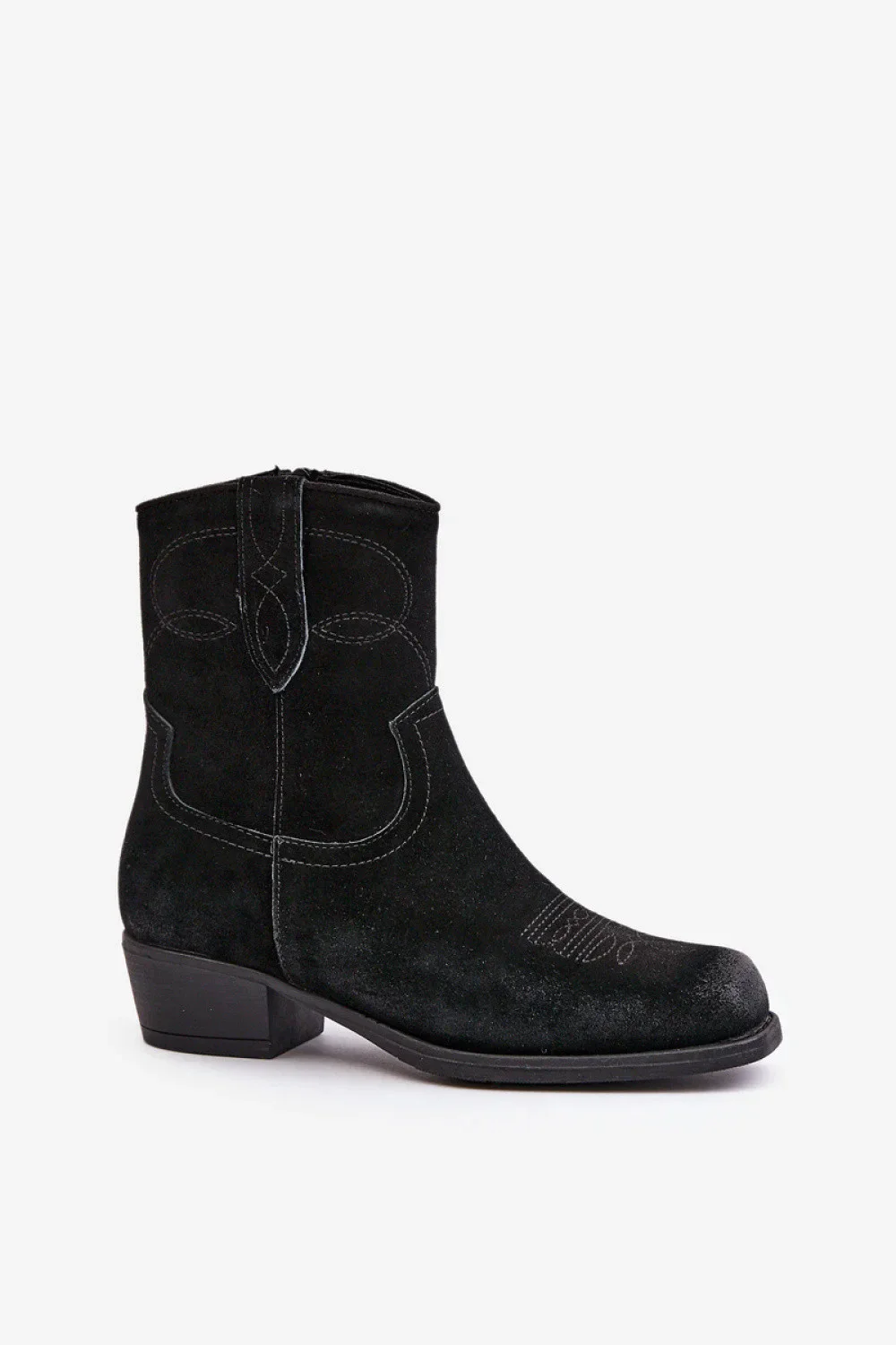 Dámské boty v kovbojském stylu. Vyrobené z přírodního semiše. Osazeny na nízkém podpatku, který zajistí stabilitu při každém kroku. Tento model se vyznačuje hranatou špičkou a prošíváním na svršku. Zapínání na zip. Zateplené dekou příjemnou na dotek, která boty udrží v teple v chladnějších dnech. Mimořádně módní střih, který byste měli mít ve svém podzimně-zimním šatníku!