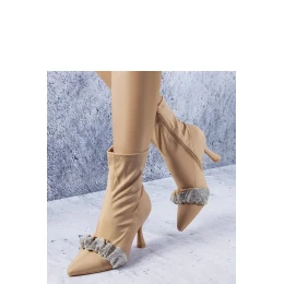 Bežové botky Caisse jsou elegantní boty na jehlovém podpatku typu Stiletto, ideální na večerní vycházky nebo speciální příležitosti. Vyrobena z hladké elastické látky, mají přiléhavý svršek za kotníkem a špičatý nos. Botky se zapínají na zip po vnitřní straně svršku, co usnadňuje jejich obouvání. Bohatě zdobené cirkony přidávají lesk a eleganci každému outfitu. Botky jsou ideální pro lidi s úzkou nohou. Velikost je standardní, takže je dobré se při výběru řídit svou vlastní velikostí. Podšívka není příliš tlustá, takže botky se skvěle hodí zejména do chladnějších podzimních a zimních dní. Podrážka je vyrobena z umělé hmoty v béžové barvě, a šněrování dodává celku půvab. Botky Caisse jsou must-have pro každou milovnici vintage módy a elegantního stylu. materiál plátno