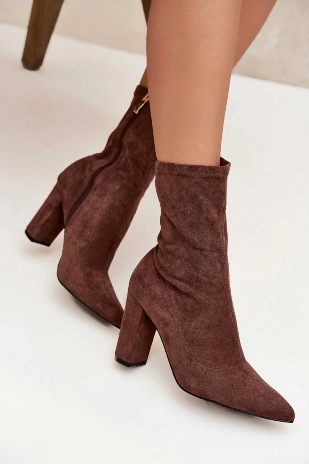 Elegantní dámské botky vyrobené z ekologického semiše jsou model, který podtrhne každý outfit. Umístěné na stabilním sloupkovém podpatku poskytují pohodlí a ženský vzhled, zatímco špičaté špičky opticky prodlužují nohy. Zapínání na praktický zip usnadňuje obouvání a svlékání. Jemné švy na svršku jsou stylovým detail, který tento model vyzdvihuje. Ideální jak pro každodenní, tak elegantní outfit.
