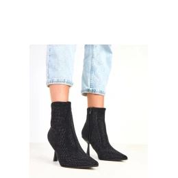 Oslnivé dámské botky na podpatku vyrobené z měkké, ekologické semišové kůže. Model ohromuje elegantním střihem a zpracováním, celá plocha boty je pokryta třpytivými zirkony, které krásně odrážejí světlo a dodávají botám výjimečný večerní charakter. Štíhlý špičatý nos a 9centimetrový podpatek ve tvaru jehly opticky prodlužují nohy a zvýrazňují postavu. Střih o výšce 14 cm jemně objímá kotník a zapínání na zip zaručuje pohodlí při obouvání. Vnitřek je vybaven měkkou látkou, což zajišťuje pohodlí při nošení. Ideální volba pro ženy, které ocení eleganci a lesk, skvěle se hodí k večerní, koktejlové nebo speciální příležitosti.