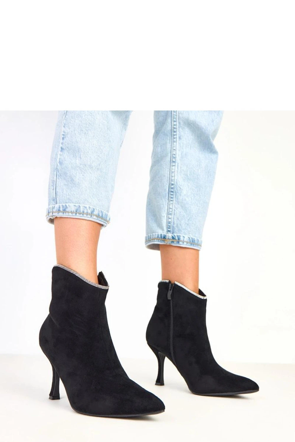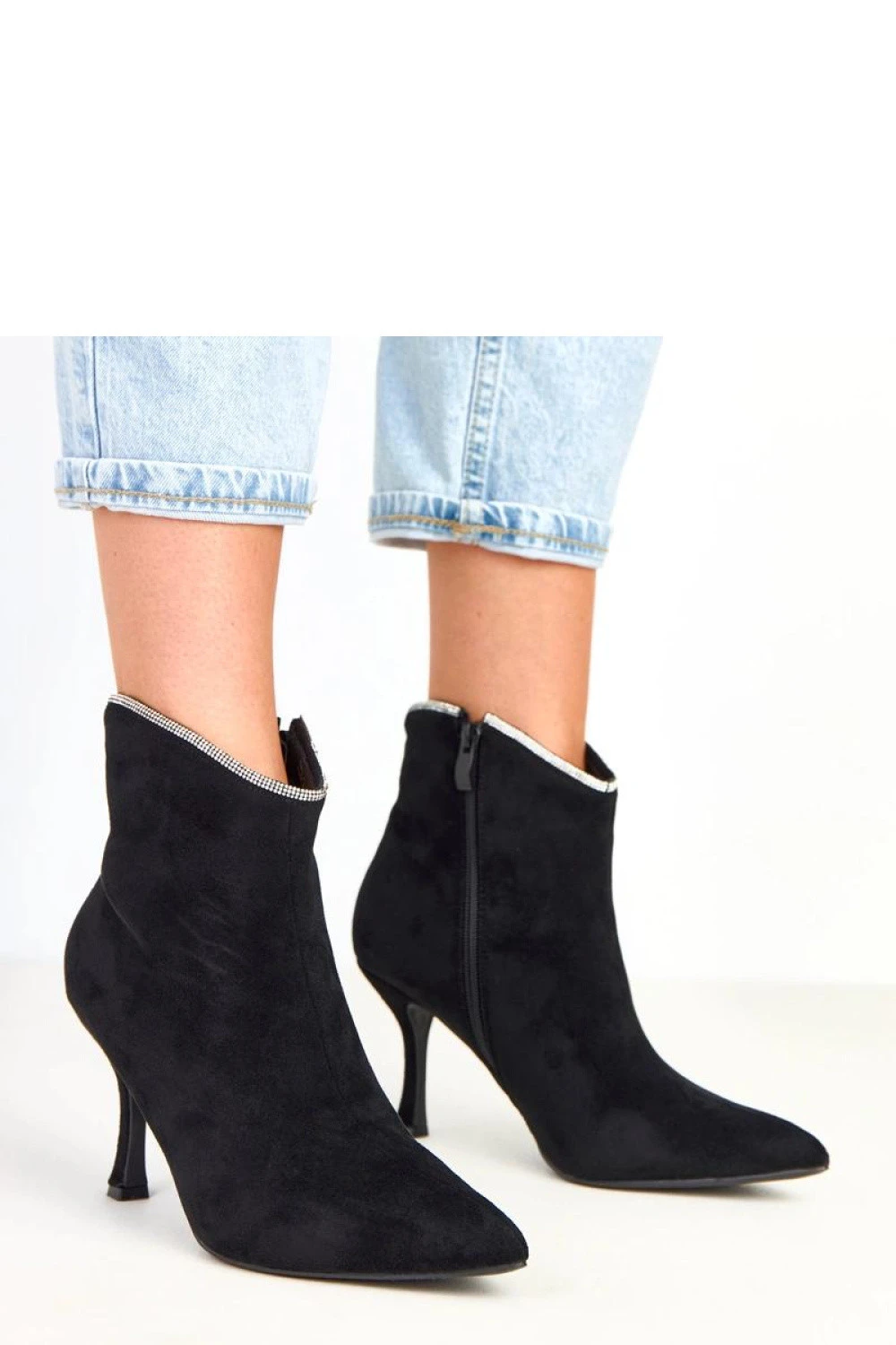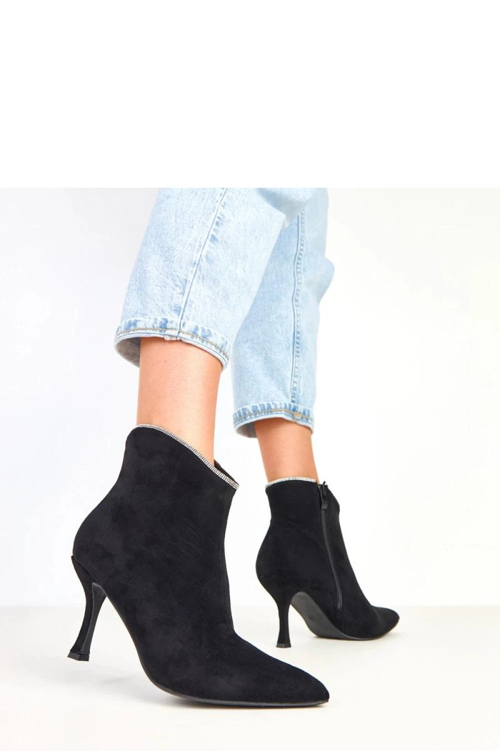 Elegantní dámské kotníčkové boty vyrobené z měkké ekologické semišové kůže, které se vyznačují decentním, ale zároveň efektním detailen, zdobením sirkony na horním okraji podpatku. Tento drobný ozdoby přidává botám eleganci a skvěle ladí s večerními stylizacemi. Model s 12 cm vysokým kotníkem jemně obepíná kotník, špičatý nos a 8,5 cm sloupcový podpatek krásně zjemňují postavu, zajišťují stabilní a pohodlný chůzi. Praktické zapínání na zip usnadňuje obouvání, a vnitřní část je vybavena měkkou látkou bez podšívky, díky čemuž se boty skvěle hodí do přechodného období. Ideální volba pro ženy, které ocení eleganci s nádechem lesku.