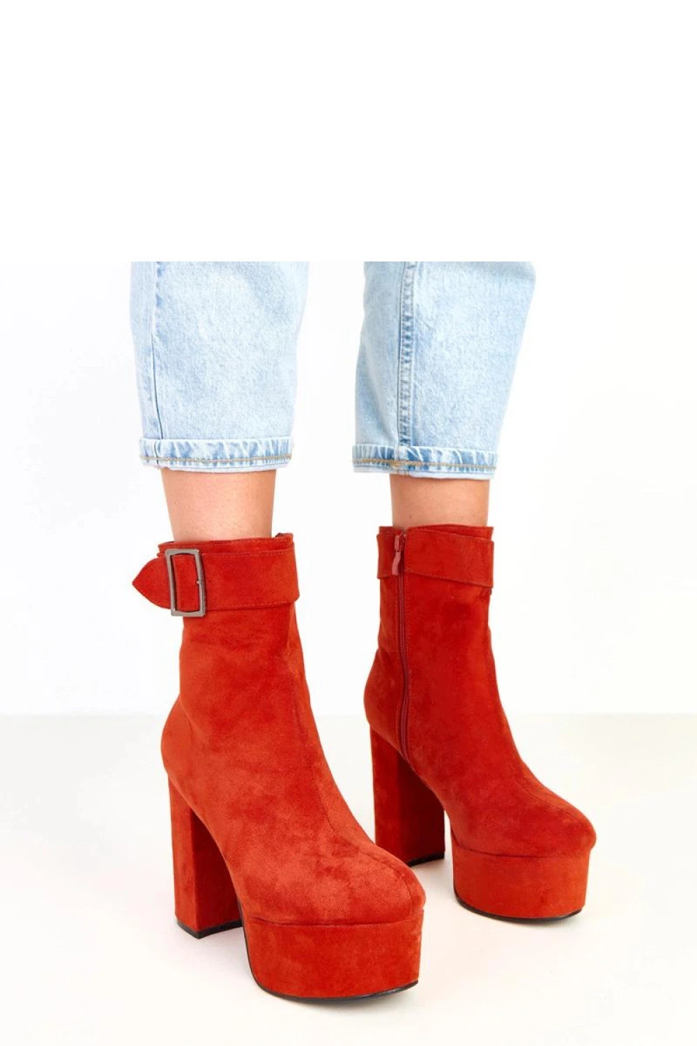 Elegantní dámské kotníčkové boty vyrobené z měkké ekologické semišové kůže, které se vyznačují ozdobnou sponou nahoře na lýtce, dodávající eleganci a charakter. Model má kulatou špičku, 12centimetrový sloupkový podpatek a 4,5centimetrovou platformu, co zaručuje pohodlí a stabilitu při chůzi. 17centimetrová lýtka jemně obepíná nohu a praktický zip usnadňuje obouvání. Vnitřek je vybaven textilií a absence podšívky z ní dělá ideální boty na přechodné období. Jedná se o módní a elegantní model, který skvěle ladí jak s každodenními, tak s více výstavními outfity.