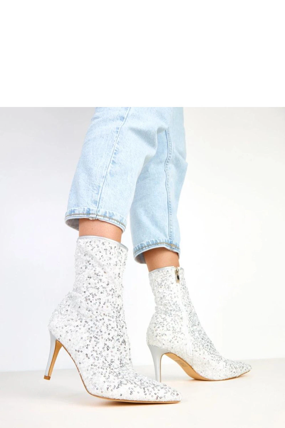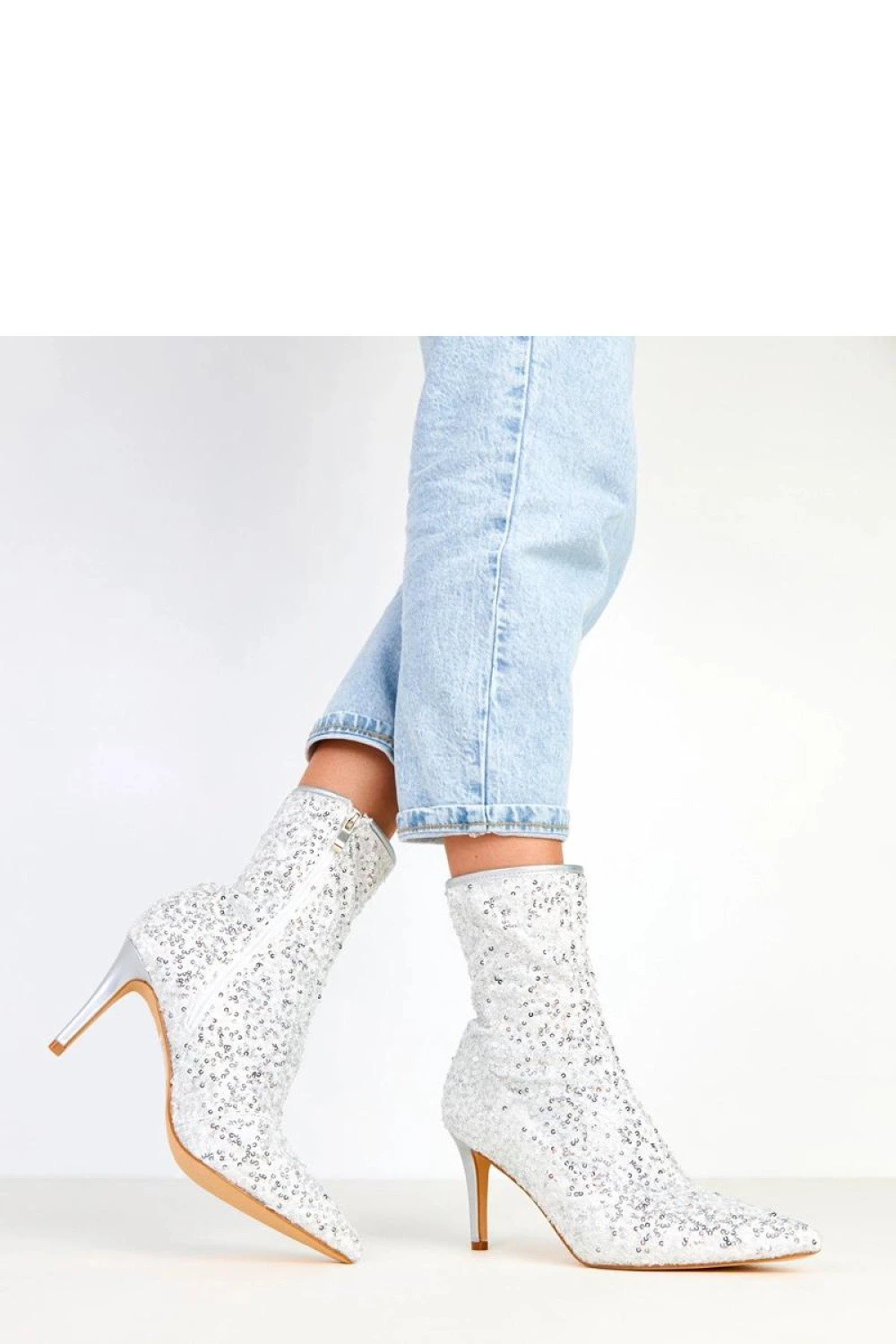 Elegantní kotníkové boty, které ohromují originálním designem a leskem cekínového dokončení. Vyrobené z látky, prezentují se mimořádně efektně, zdůrazňují každý outfit. Model s špičatou špičkou a štíhlým jehlovým podpatkem o výšce 8,5 cm zjemňuje postavu a dodává ženskou eleganci. 18 cm vysoký svršek a praktický zip zaručují pohodlné používání. Vnitřek bot je vyroben z látky, co zvyšuje pohodlí nošení. Ideální na speciální příležitosti, kdy chcete zářit a vynikat stylem.