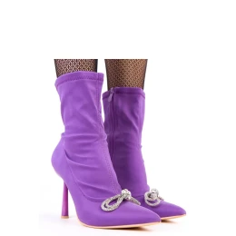 Satenové botky na jehlovém podpatku s ozdobnou mašlí s cirkonii jsou nabídkou pro ženy, které rády vynikají elegancí a neokoukaným stylem. Vyrobené z jemné látky s decentním leskem, působí velmi elegantně, a dekorativní mašle zdobená cirkonii jim dodává luxusní charakter. Klenutý, špičatý nos a 16 cm vysoký svršek krásně zdůrazňují linii nohy. Stabilní jehlový podpatek o výšce 10,5 cm opticky zjemňuje postavu a dodává celku ženský šarm. Ekologická kůžená stélka zajišťuje pohodlí při nošení, a praktické zapínání na zip usnadňuje obouvání. Model přes kotník je ideální volbou na výjimečné příležitosti, kdy záleží na eleganci a efektním detailu.