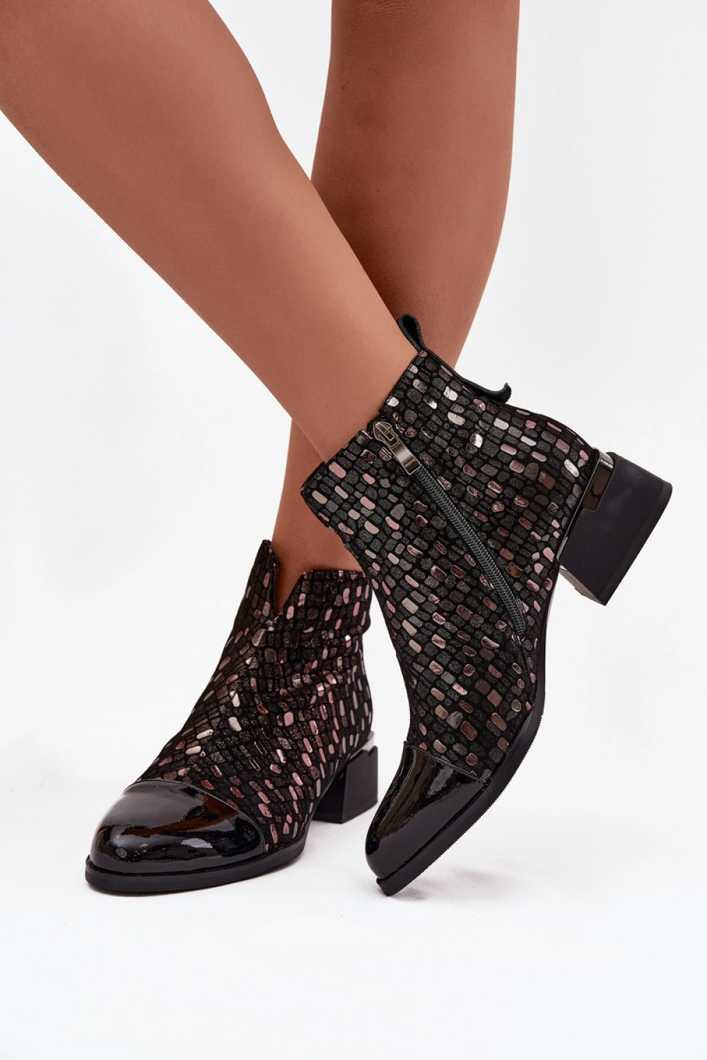 Elegantní dámské kotníčkové boty vyrobené z kombinace lakované přírodní kůže a semiše jsou výjimečným návrhem pro ženy, které si cení originálního stylu a vysoké kvality. Kombinace obou materiálů dodává výrazný charakter, a lesklý vzor na svršku přitahuje pozornost a zdůrazňuje jejich eleganci. Model je umístěn na stabilním podpatku ve formě bloku, který jemně zvedá siluetu, zajišťuje pohodlí při nošení po celý den. Vnitřek je vyztužen koženou stélkou, která zaručuje teplotní komfort v chladnějších dnech, díky čemuž se botky skvěle osvědčí v podzimně-zimní sezóně. Tato obuv skvěle doplní jak každodenní stylizace s džínami, tak i sofistikované sestavy se sukní nebo šaty, dodávajíc jim eleganci.