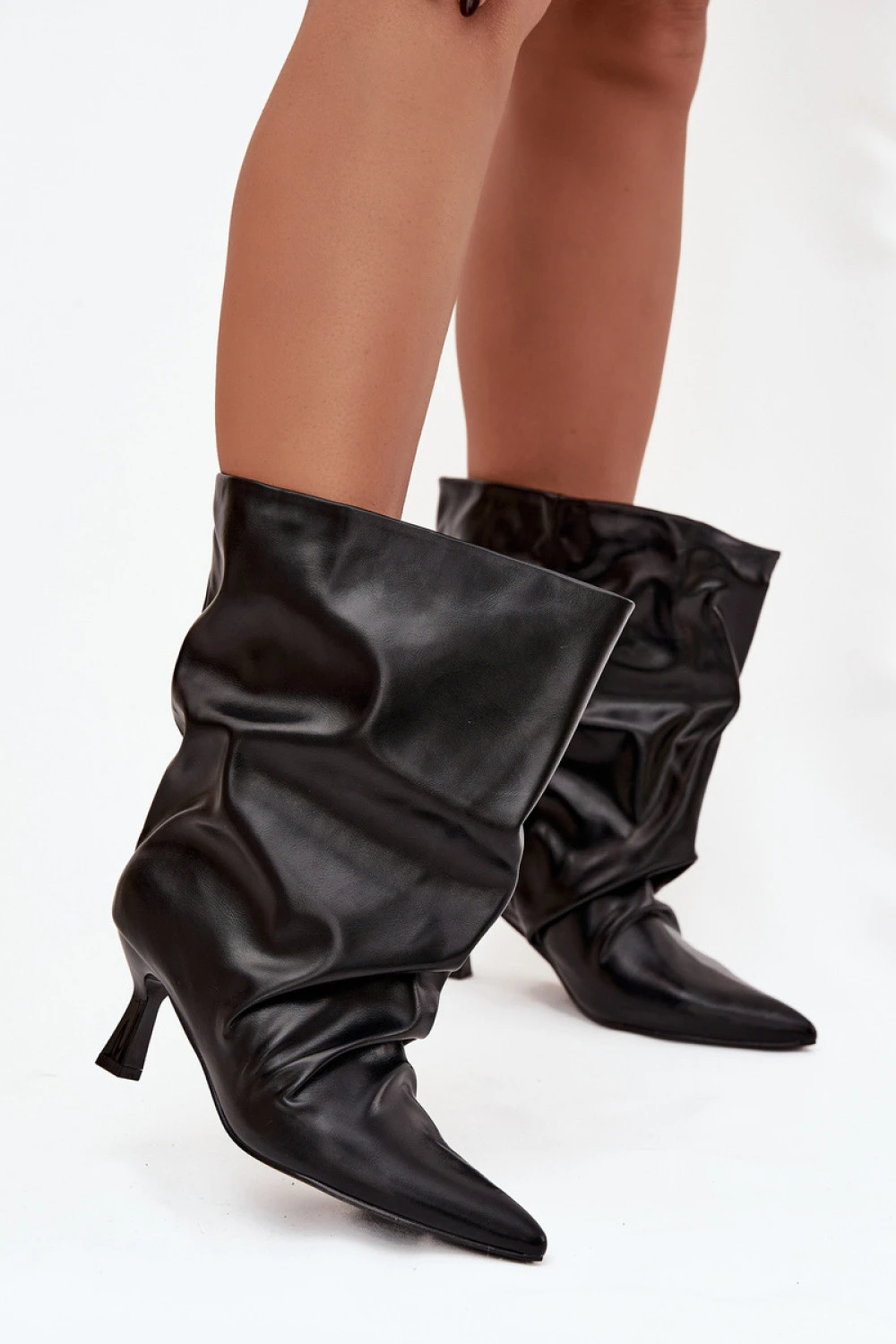 Dámské botky vyrobené z ekokůže jsou stylovým modelem, který kombinuje eleganci s módním akcentem. Umístěné na štíhlém podpatku krásně zdůrazňují siluetu a přidávají ženskou grácii. Zapínání na zip zajišťuje pohodlné obutí a široký, zmačkaný svršek jim dodává výjimečný, moderní charakter. Jsou to efektní botky, které skvěle doplní jak každodenní, tak večerní outfit.