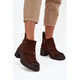 Boty pro ženy vyrobené z přírodního semiše jsou stylovým návrhem na podzimní a zimní sezónu. Model s masivním podpatkem ve tvaru bloku poskytuje stabilitu a pohodlí při chůzi. Nízký svršek a praktický zip usnadňují obouvání. Vnitřek vyložený filcem zaručuje teplo v chladnější dny. Jemný zlatý detail a ozdobná spona dodávají celku elegantní charakter. Jsou to boty, které skvěle kombinují klasiku s moderním zpracováním, ideální pro každodenní a formální stylizace.