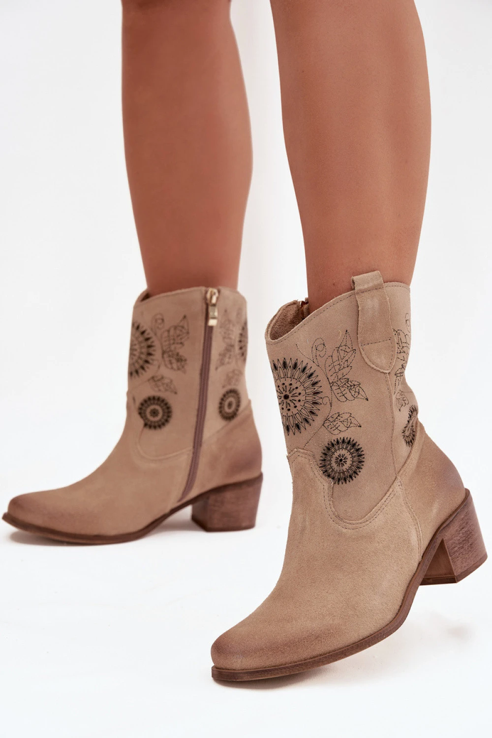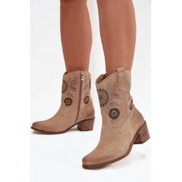 Dámské kotníčkové boty vyrobené z přírodního semiše jsou elegantní a stylovou volbou pro přechodné období a teplejší podzimní dny. Jemný ažurový vzor dodává celku lehkost a jedinečný charakter. Model je umístěn na stabilním podpatku ve tvaru bloku, který poskytuje pohodlí při chůzi a jemně zdůrazňuje postavu. Mandlový tvar špičky. Zapínání na zip usnadňuje obouvání a svlékání, čímž zajišťuje pohodlí při každodenním nošení. Jsou to kotníčkové boty, které skvěle doplní jak každodenní, tak elegantní outfit, dodávají jim subtilní eleganci a módní charakter.