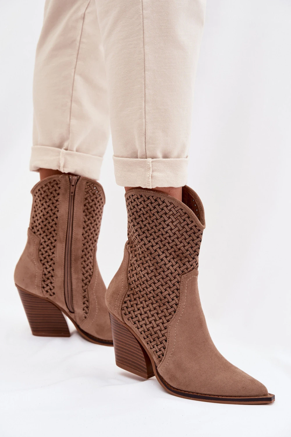 Botky pro dámy vyrobené z ekologického semiše jsou stylovým návrhem na přechodné období. Prostřednictvím perforovaného dokončení svršku získávají lehkost a moderní charakter, zatímco úzké prodloužené špičky zdůrazňují linii nohy. Stabilní, zkrácený podpatek zajišťuje pohodlí při každodenním nošení, zatímco zip usnadňuje obouvání a svlékání obuvi. Tento univerzální model se skvěle hodí jak do každodenních outfitů, tak do elegančnějších stylizací.