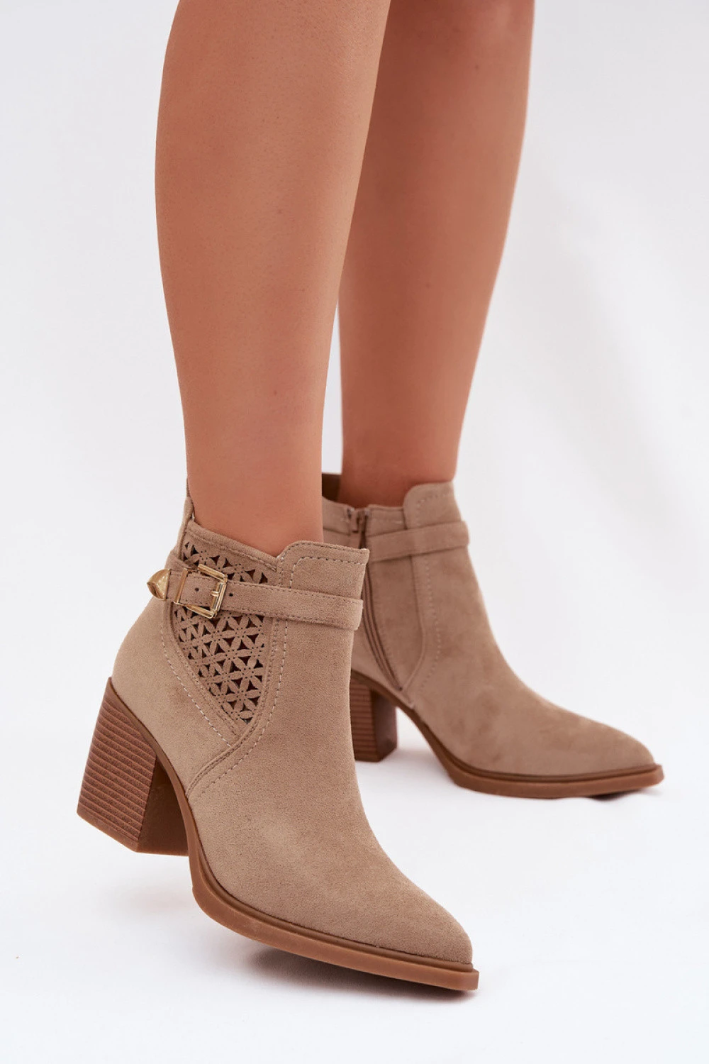 Botky značky JEZZI jsou elegantním návrhem s módním charakterem. Vyrobené z ekokože, působí stylově a žensky. Model je zdoben dírkovaným vzorem umístěným po straně svršku a páskem s zlatou sponou. Špičaté špičky opticky zúží nohu, stabilní sloupkový podpatek zaručuje pohodlí a jistotu kroku. Zapínání na zip usnadňuje rychlé obouvání. Jsou to botky, které se skvěle hodí jak do každodenních, tak do elegantnějších stylizací.