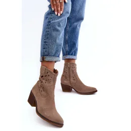 Dámské boty v kovbojském stylu byly vyrobeny z přírodního semiše. Tento model má na celém svršku ažurový vzor. Kovbojské boty jsou posazeny na jehlovém podpatku. Model se zapíná na zip na boku svršku. Špičatá špička opticky zeštíhlí nohy. Tento model by měl být váš!