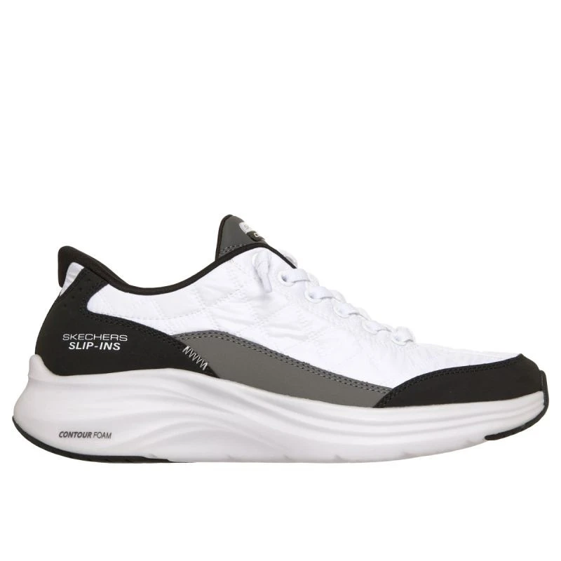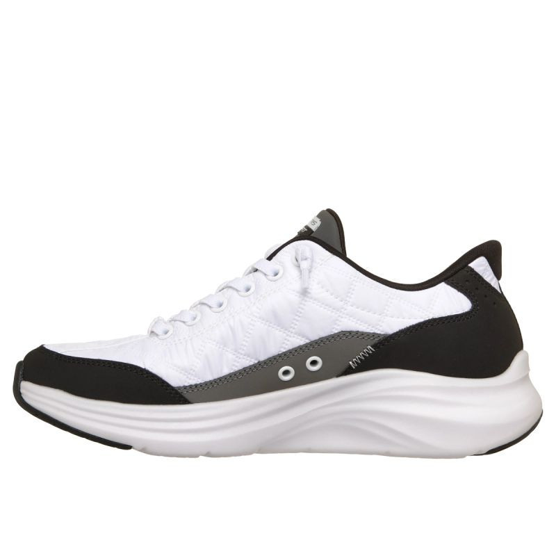 Veganský nazouvací model s naším jedinečným polštářem Heel Pillow™, prošívaným svrškem Cozy Fit™ se syntetickými překryvy a elastickými podvazkovými tkaničkami, odpružením mezipodešve Contour Foam™ a stélkou s naším patentovaným odpružením Skechers Air-Cooled Memory Foam™.