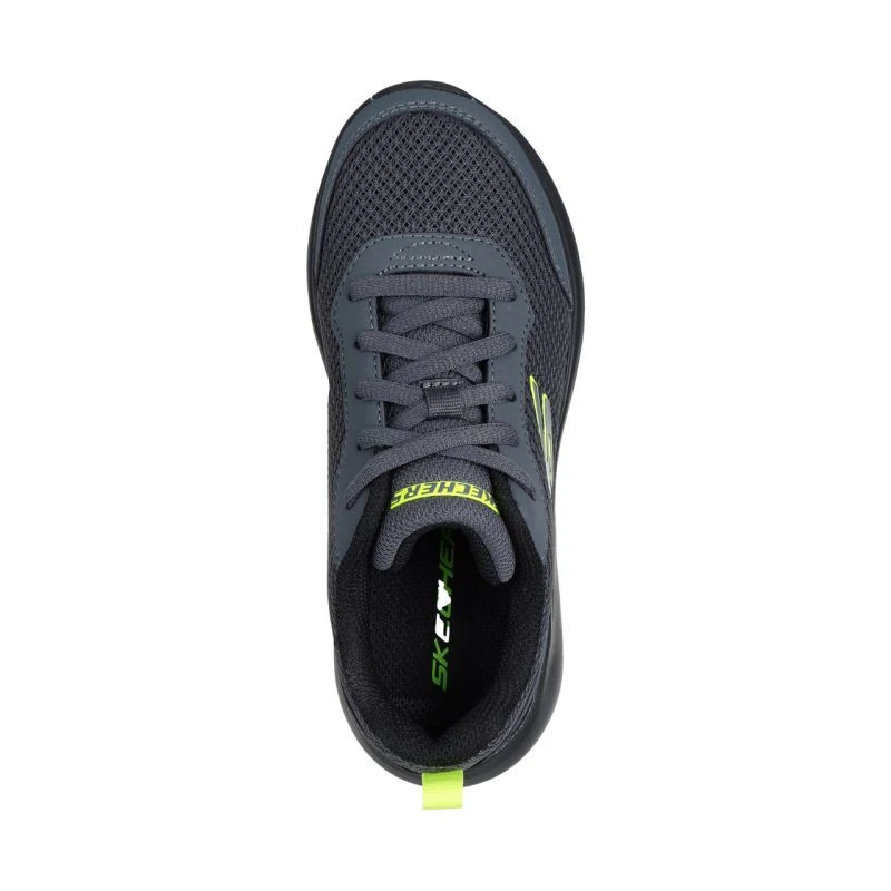 Textilní svršek se síťovanou strukturou se syntetickými výztuhami. elastické pásky připomínající klasické šněrování. adaptivní zapínání Skechers na suchý zip. gumová podrážka se postará o trakci.