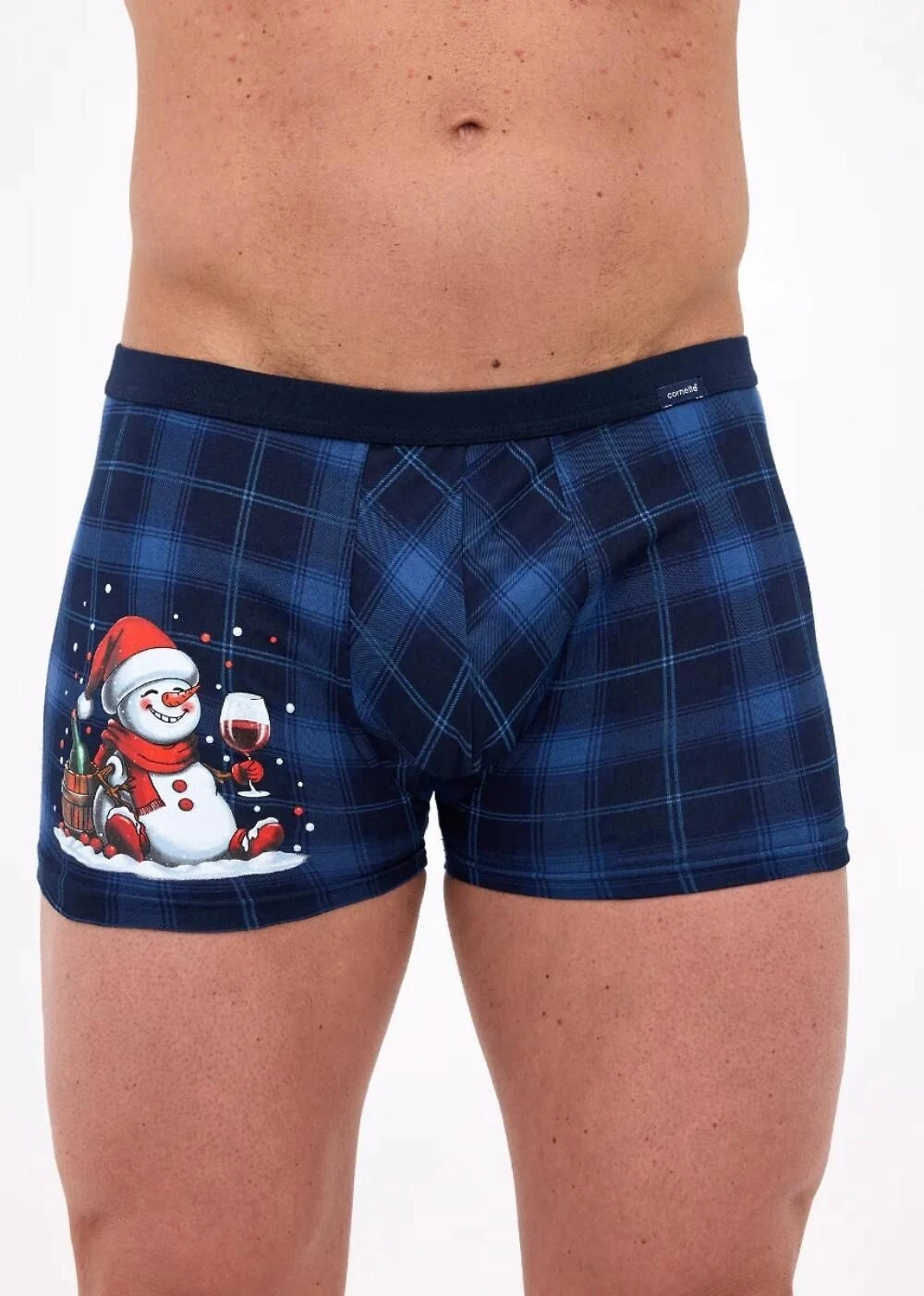 Pánské upnuté boxerky - tmavě modré kostkované s legračním sněhulákem
