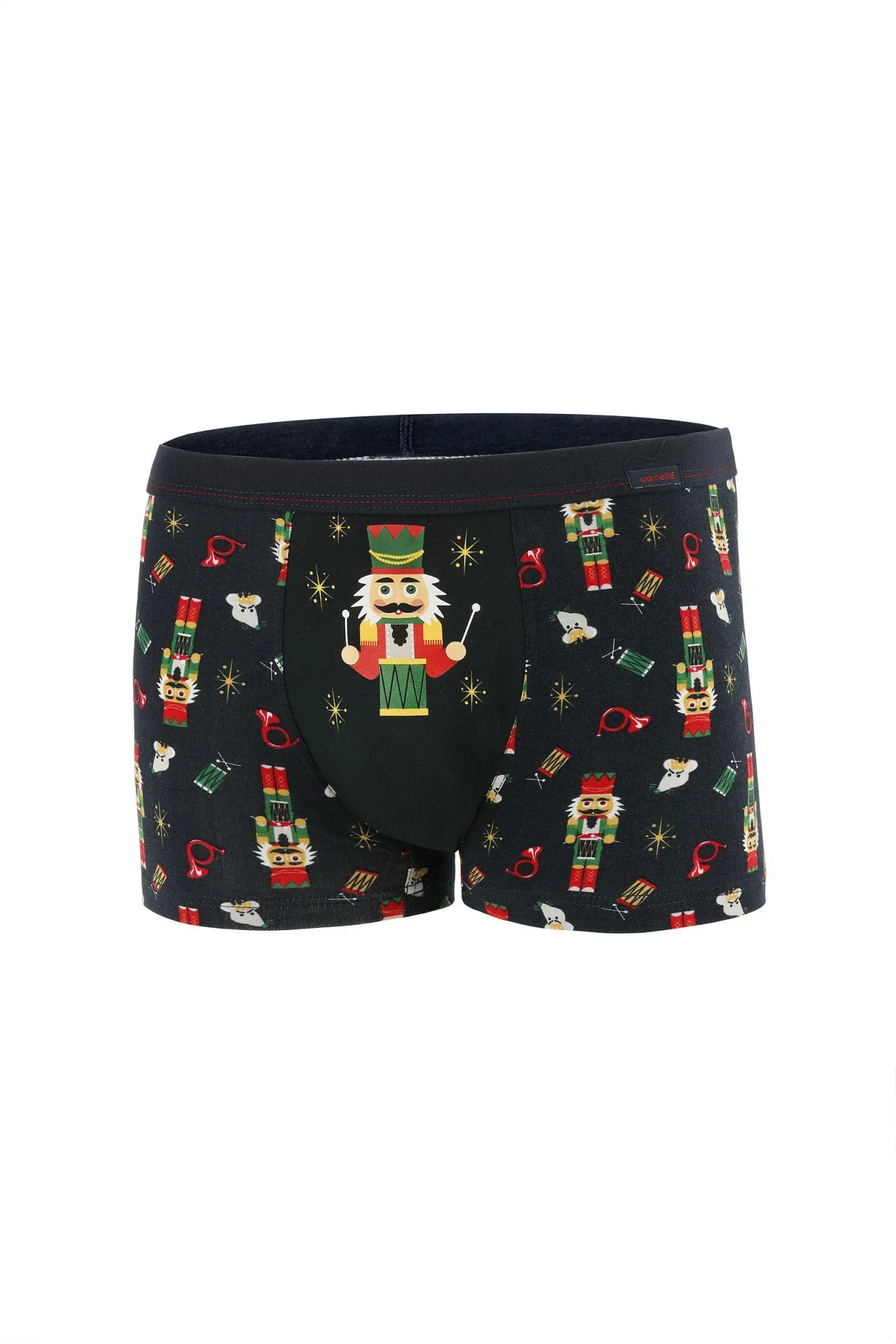Pánské tmavě modré boxerky zdobené slavnostním motivem. Ideální pro dárky. Sportovní střih, přiléhající k tělu. Měkký, pružný vysoce kvalitní bavlněný úplet. Krytá guma v tunelu. Polská, dobře známá značka Cornette. Výrobek zabalený v krabici. Složení: 95% bavlna, 5% elastan.