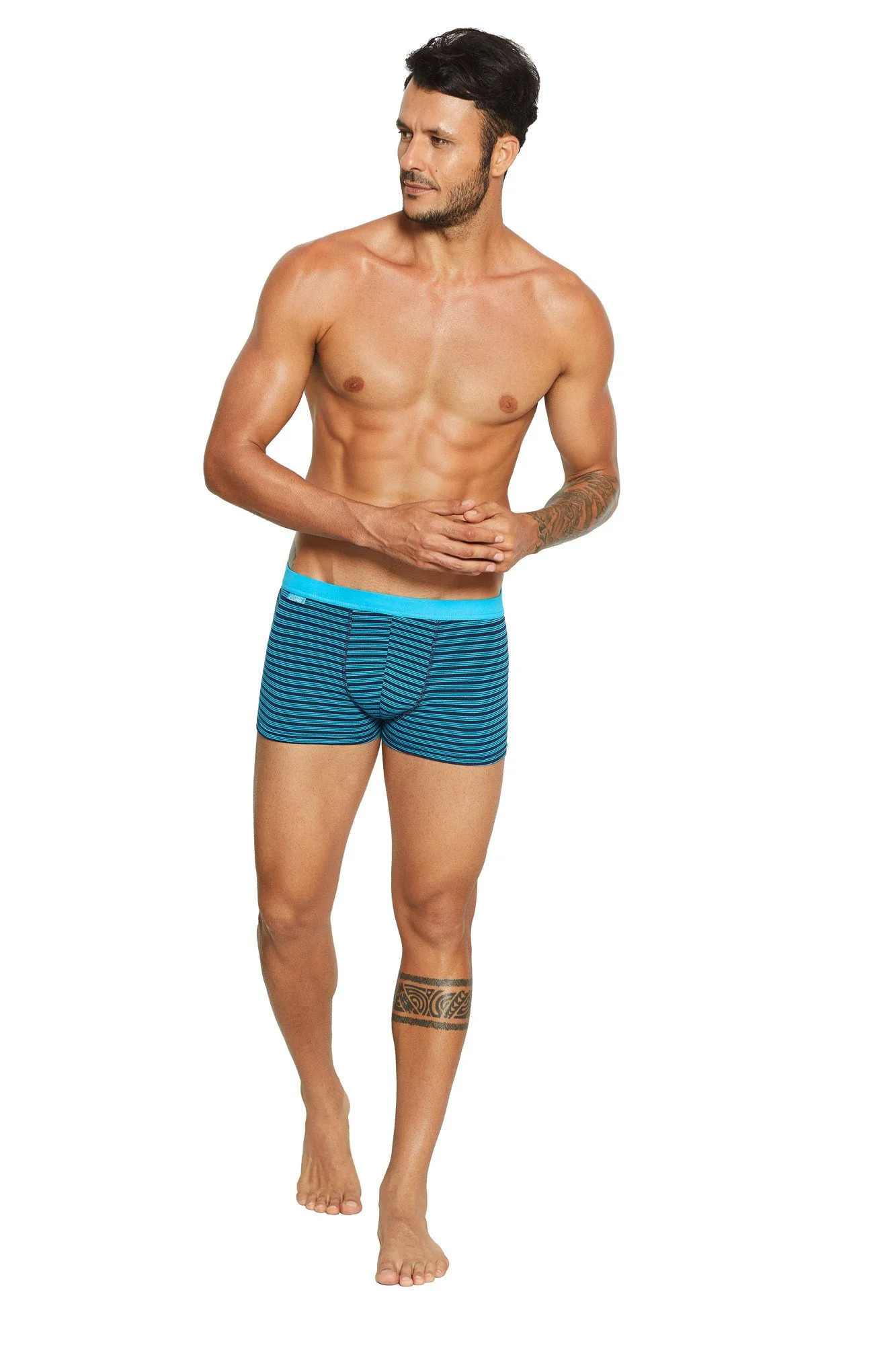 Sada 2 pánských boxerek v tmavě modré barvě. Jeden pruhovaný, druhý puntíkovaný, oba lemované kontrastní nití. Měkký bavlněný úplet. Hladká guma v pase. Složení: 95% bavlna, 5% elastan.EAN čárové kódy zboží jsou:
