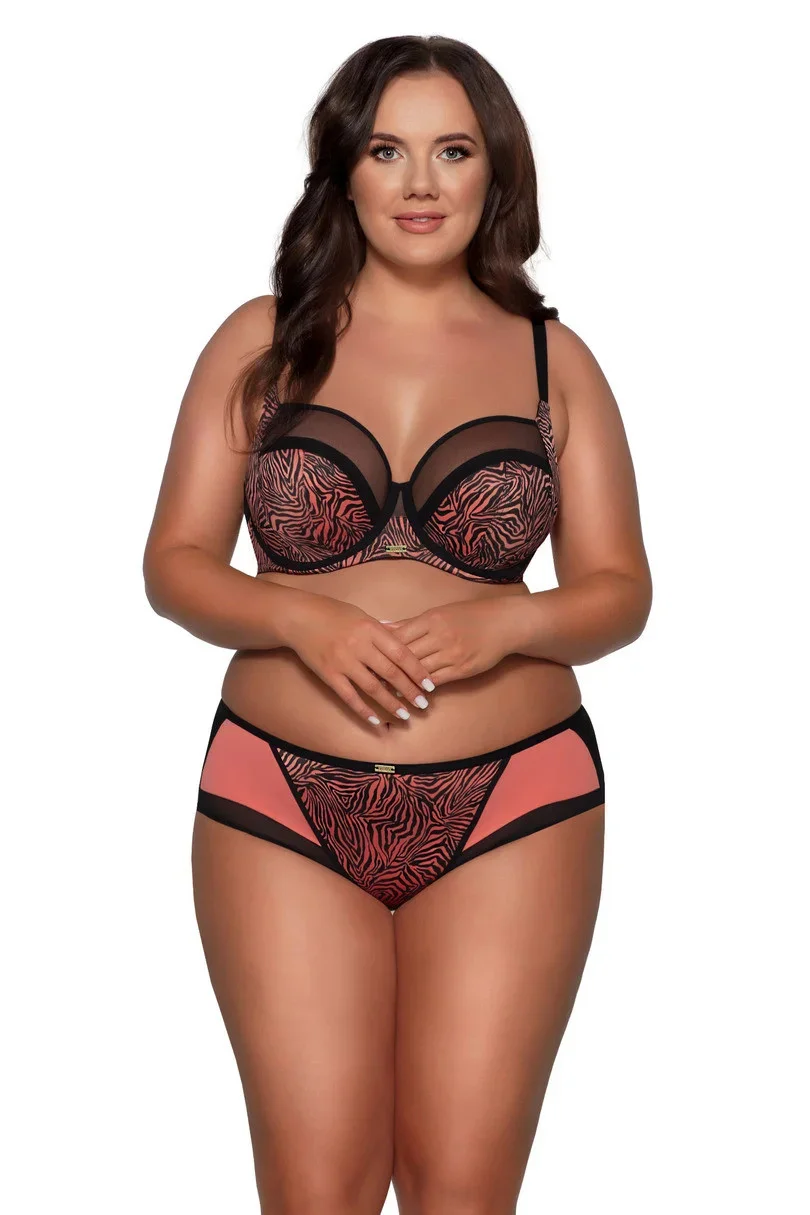 Biustonosz 1130/3 TIGER został zaprojektowany z myślą o kobietach z większym biustem, oferując zarówno wsparcie, jak i stylowy wygląd. Miseczki są wykonane z delikatnej dzianiny ozdobionej tygrysim wzorem, co nadaje mu drapieżnego charakteru. Prześwitująca siateczka, subtelnie wykończona elastyczną lamówką, dodaje biustonoszowi lekkości i elegancji, tworząc zmysłowy efekt.
