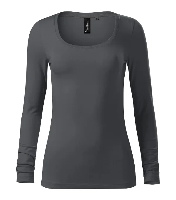 strečový materiál udržující stálost tvaru přiléhavý střih s bočními švy hlubší kulatý výstřih úzký lem průkrčníku z žebrového úpletu 1:1 s 5 % elastanu vnitřní část průkrčníku začištěna kontrastní páskou zpevnění ramenních švů páskou dlouhé rukávy