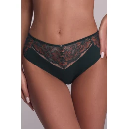 Figi brazyliany AV 2174 Azure to niezwykle kobieca propozycja, która łączy zmysłowy design z komfortem noszenia. Wykonane z miękkiej mikrofibry i efektownej dwukolorowej koronki w odcieniach głębokiej zieleni i miedzianej miedzi, prezentują się wyjątkowo elegancko. Przód zdobi trójkątna wstawka z tiulu pokryta florystycznym haftem, subtelnie podkreślając linię talii.