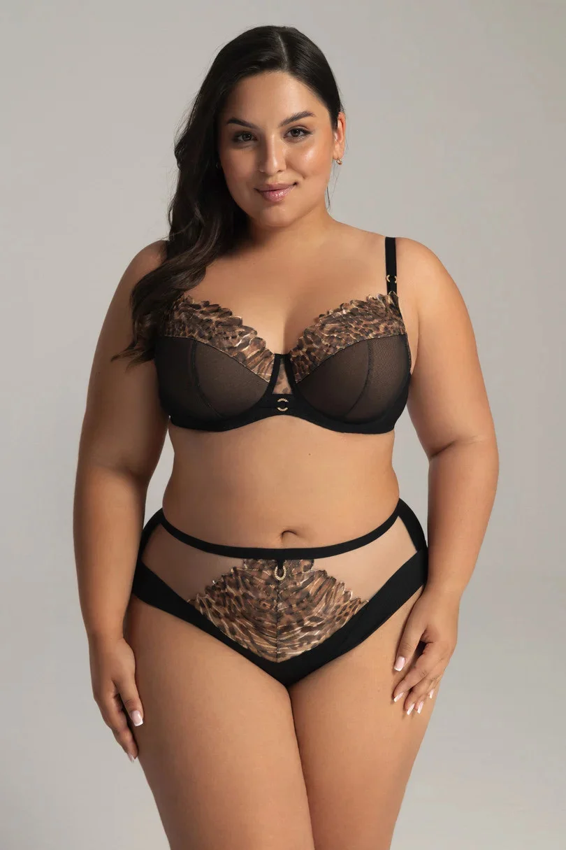 BRAZYLIANY AV 2143/B CLASSY BLACK to esencja zmysłowości w nowoczesnym wydaniu. Model inspirowany dziką elegancją – z przodu zachwyca transparentnym tiulem z haftem w motywie animal print oraz subtelną, złotą zawieszką, która dodaje luksusowego akcentu. Tył w stylu brazylijskim pięknie eksponuje pośladki, podkreślając kobiecą sylwetkę. Idealne połączenie elegancji, seksapilu i wygody – zarówno na co dzień, jak i na specjalne okazje. Sprawdzą się doskonale również dla pań noszących większe rozmiary.