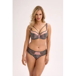 Zmysłowe majtki typu brazyliany w eleganckim połączeniu szarości i pudrowego różu to propozycja dla kobiet, które pragną połączyć wygodę z wyrafinowanym stylem. Wykonane z delikatnej, półtransparentnej koronki o kwiatowym wzorze, subtelnie oplatają biodra, podkreślając kobiece kształty. Przód zachwyca siateczkową wstawką w kolorze różowym, ozdobioną dwoma małymi kokardkami, co dodaje całości lekkości i romantyzmu. Tył z finezyjnie wykończoną koronką tworzy kuszący efekt, jednocześnie zapewniając komfort noszenia dzięki elastycznym krawędziom. Idealne zarówno na specjalne okazje, jak i do codziennego użytku.