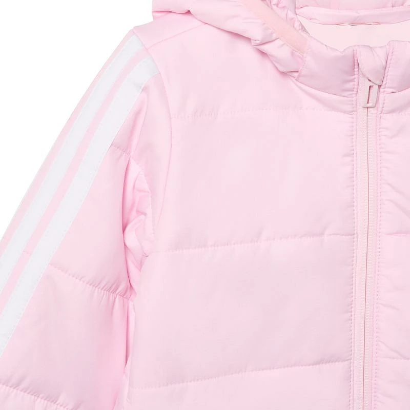 2 Dětská bunda adidas je ideální pro zimní dny. Standardní střih. Syntetické výplně rozmístěné v horizontálních panelech v kombinaci s technologií Climawarm zahalují tělo teplem a zároveň nabízejí odvod přebytečné vlhkosti. Zip s průběžnou délkou. Odnímatelná kapuce bez možnosti nastavení. Reflexní detaily. Materiál: 100% recyklovaný polyester.