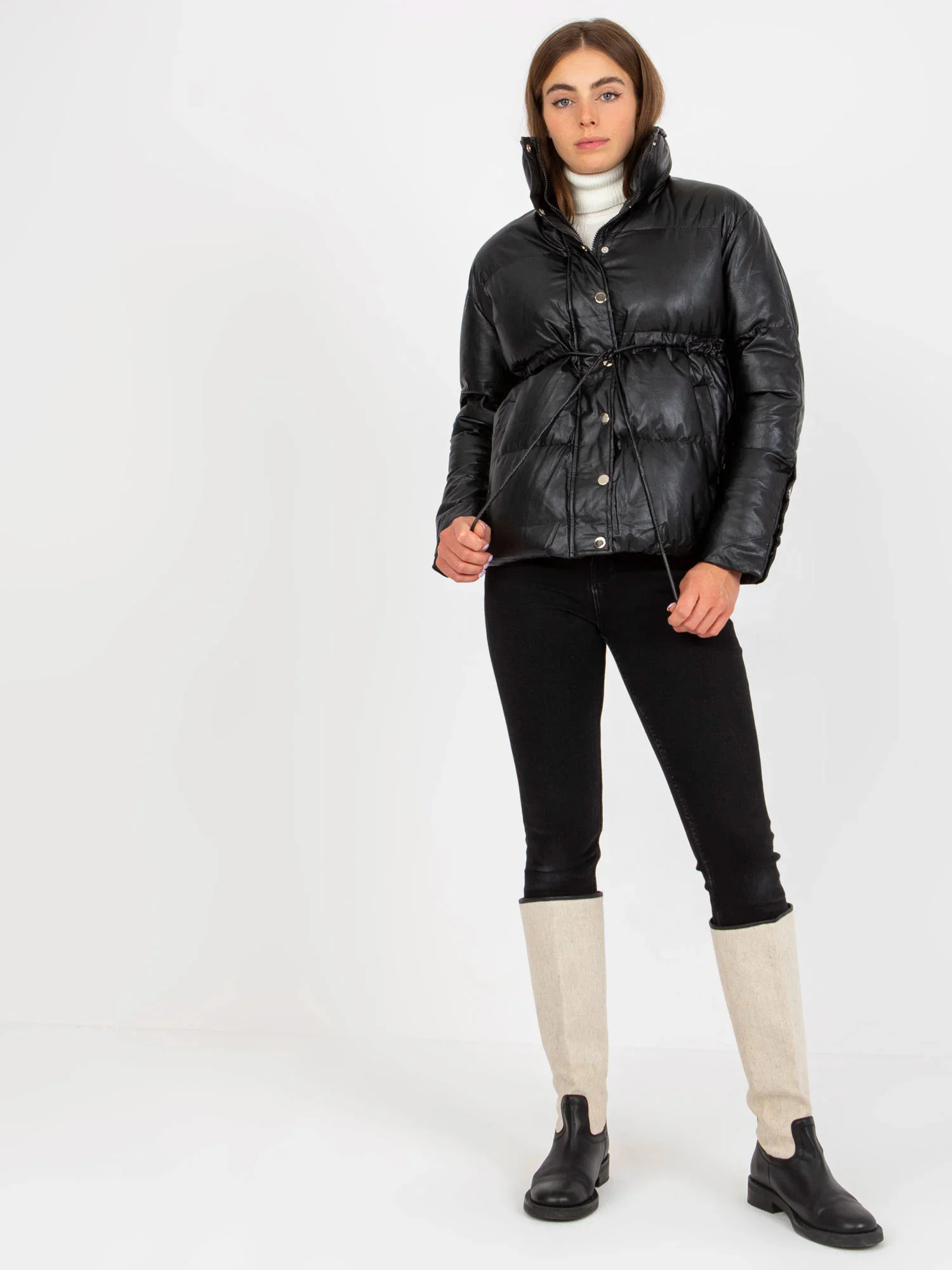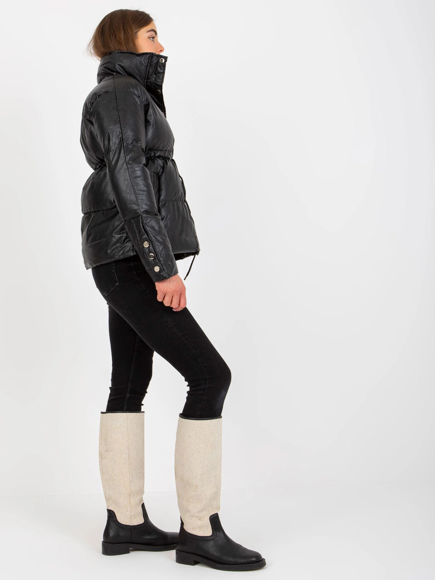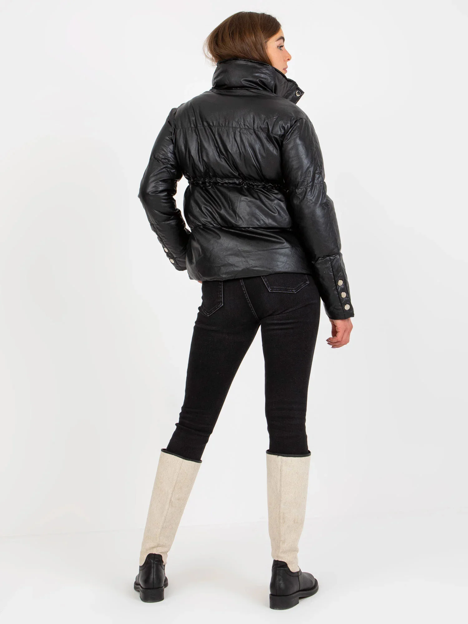 Černá zimní bunda z ekokůže s žebrovanými lemy .