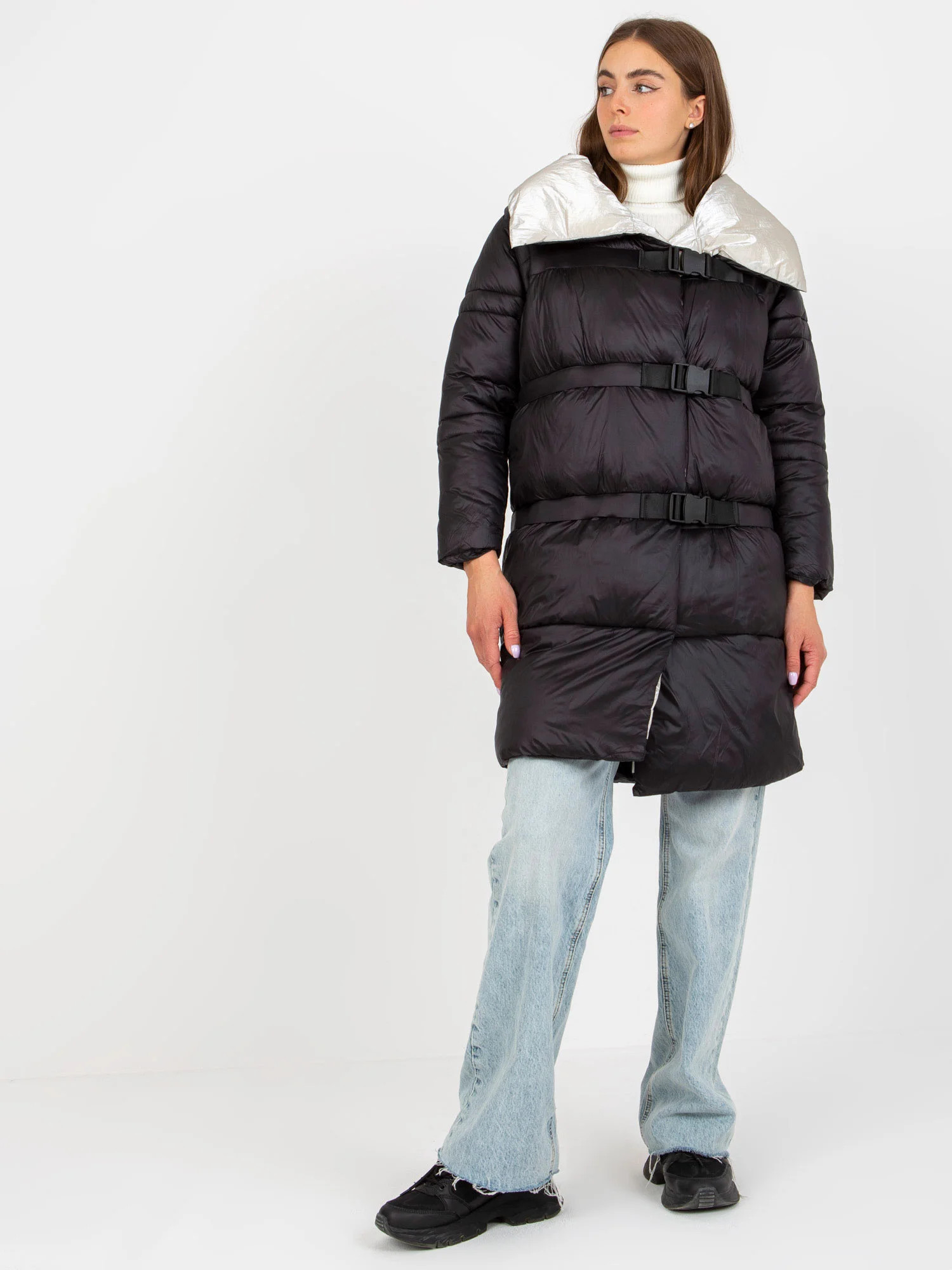 Černo-béžová péřová zimní bunda 2 v 1 s odepínacími rukávy .