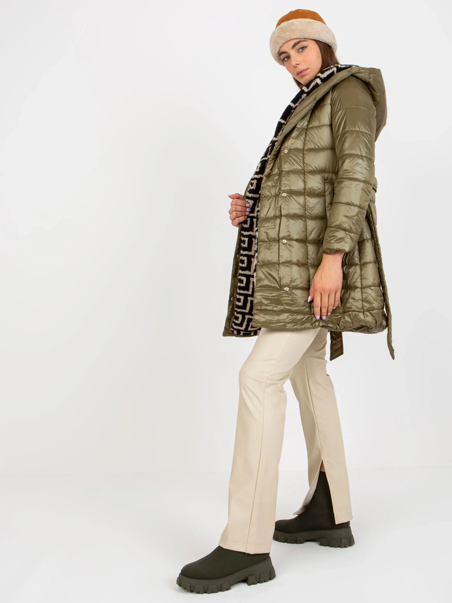 Khaki prošívaná přechodová bunda s páskem .