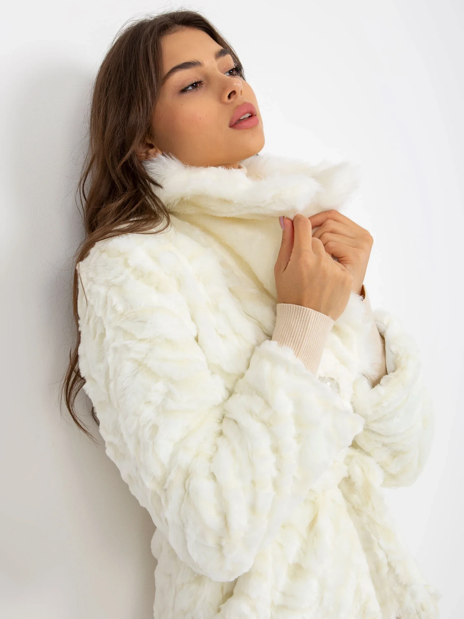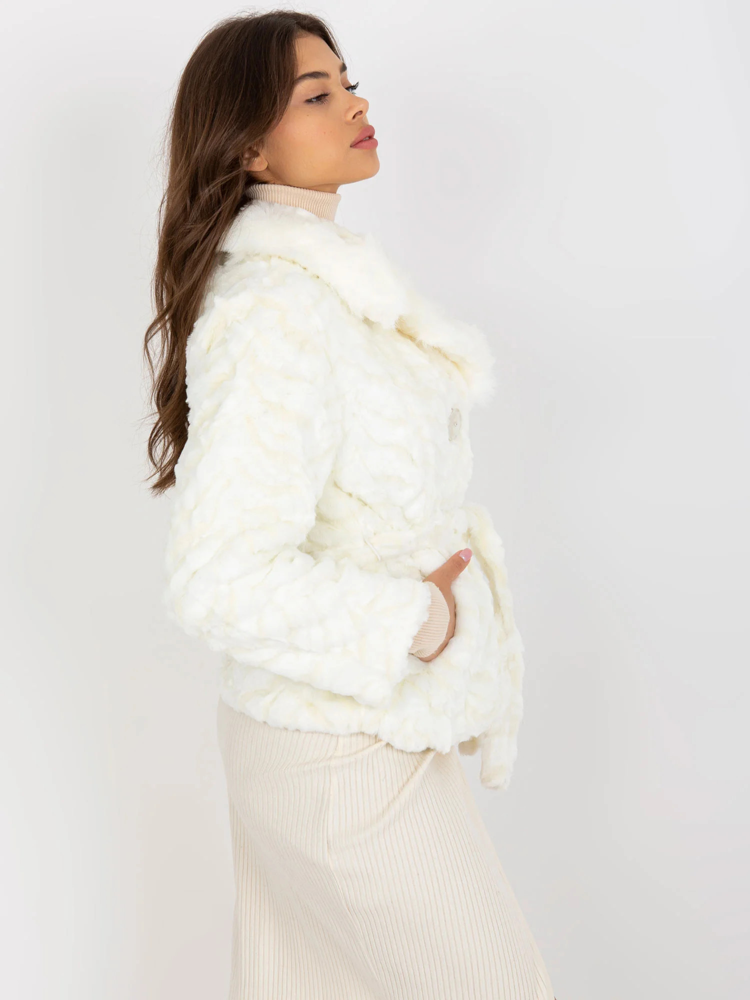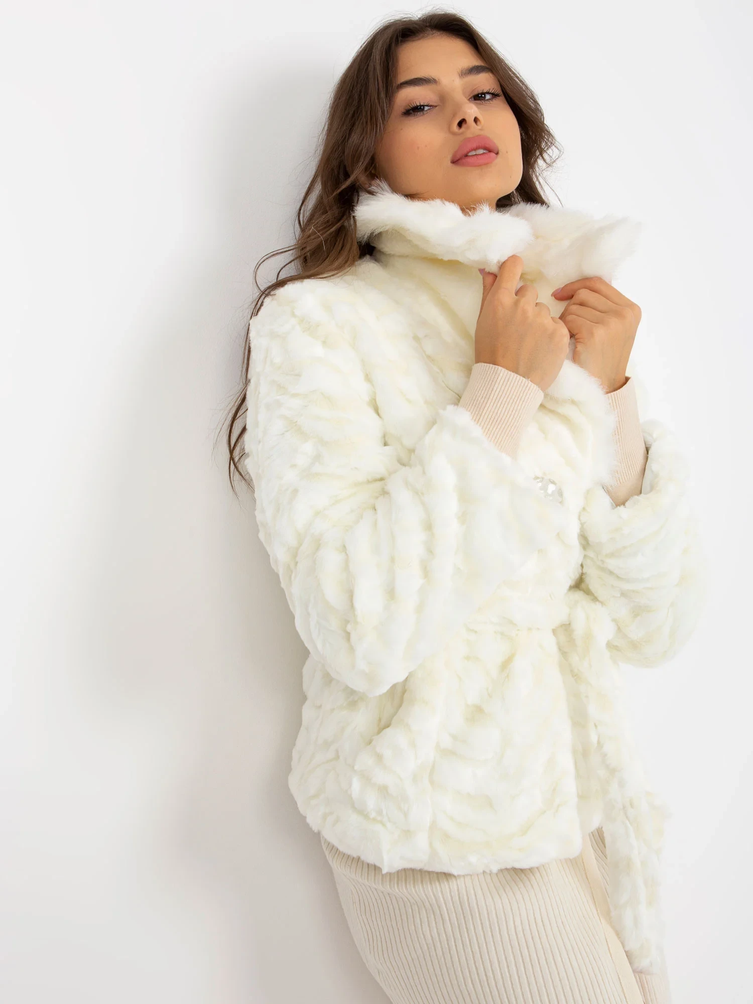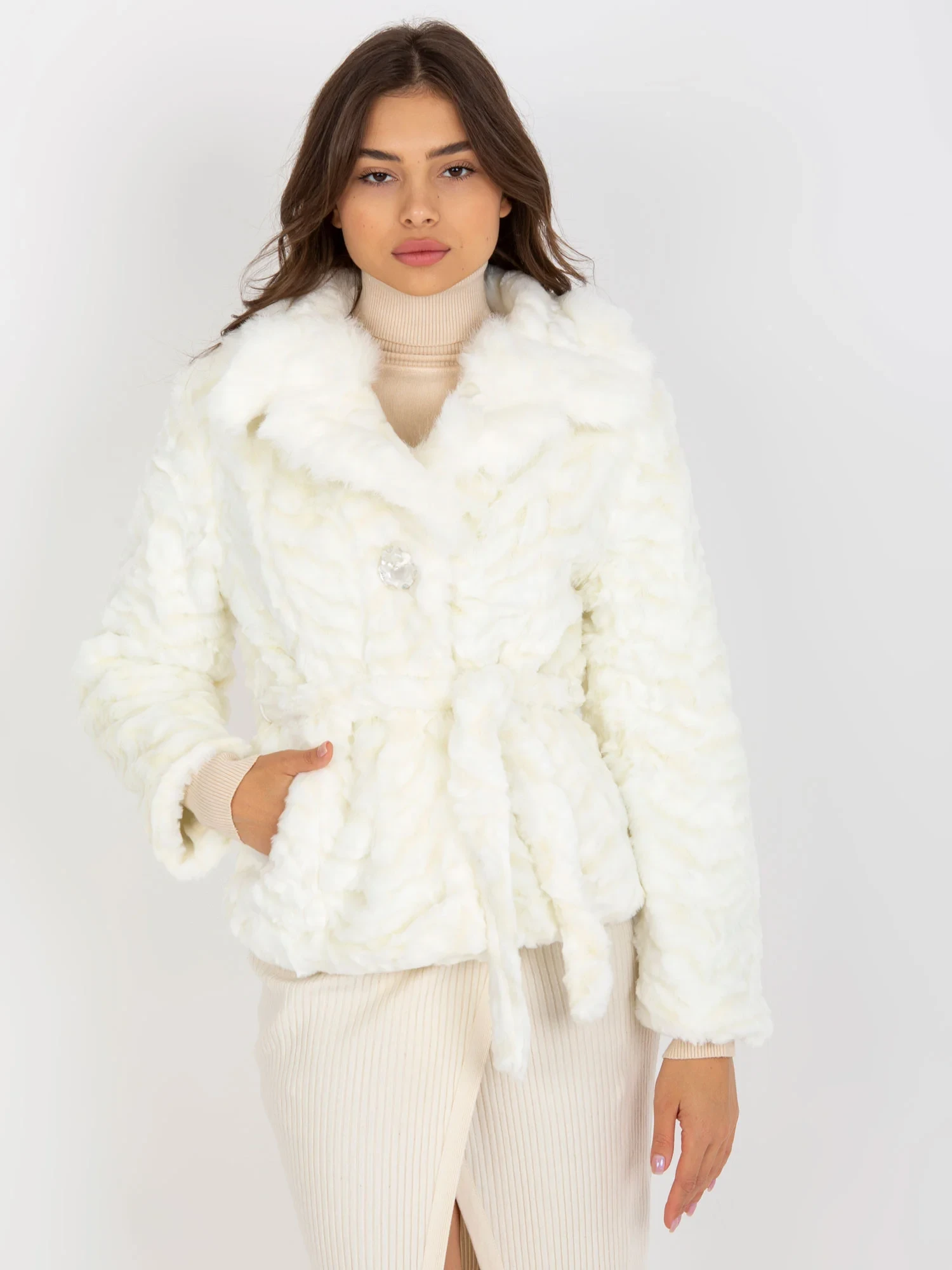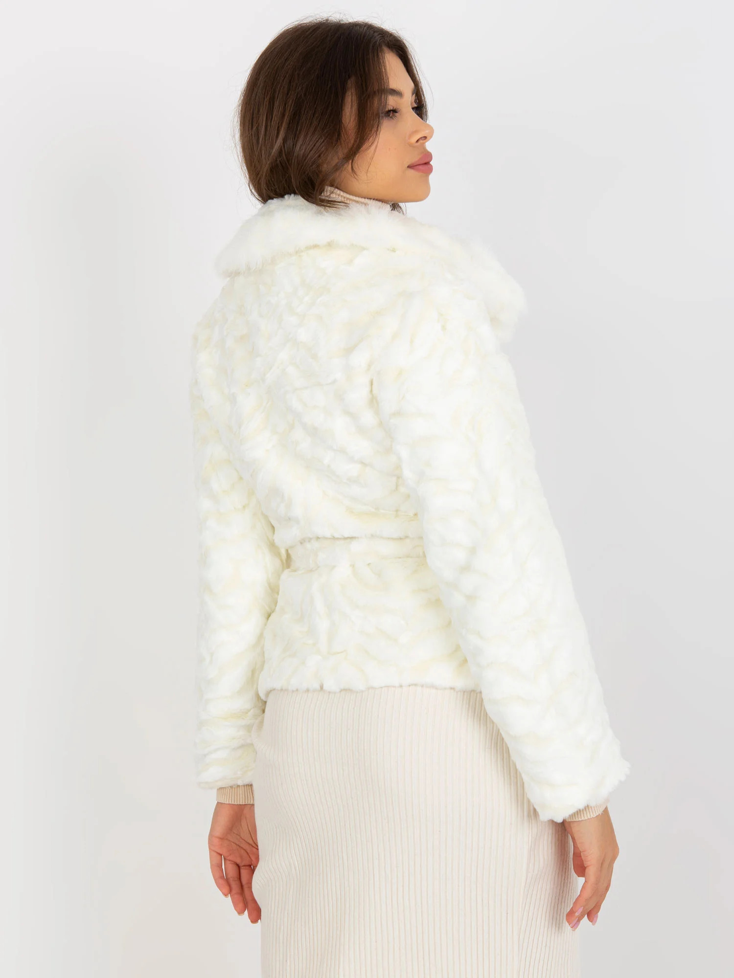 Bílá zimní bunda s kožešinou a páskem na zavazování .