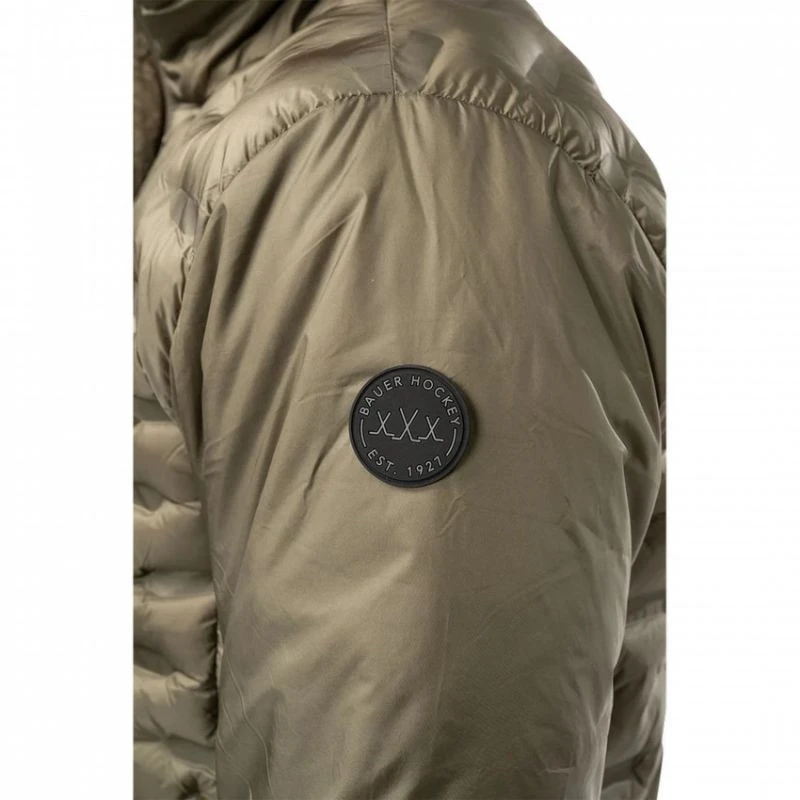 Kurtka Bauer Flc Packable Puffer Sr To lekka i składana kurtka puchowa z izolacją PrimaLoft ThermoPlume Insulation. Jest doskonała na chłodne dni, oferując znakomitą izolację cieplną i odporność na wilgoć. Dzięki możliwości składania jej w niewielką torbę lub plecak, jest niezwykle praktyczna w podróży. Kurtka posiada wysoki kołnierz, pełny zamek błyskawiczny, dwie boczne kieszenie i elastyczne mankiety. Na lewym rękawie znajduje się naszywka Bauer. Dostępna jest w kolorze oliwkowym z pikowanym wzorem. Jeśli poszukujesz lekkiej, ciepłej i stylowej kurtki puchowej, która sprawdzi się w każdej sytuacji to idealny wybór dla Ciebie. Główne cechy: Zwężany krój hokejowy Izolacja PrimaLoft® ThermoPlume® Połączone pikowane panele Zamek błyskawiczny YKK® na środku z przodu z osłoną przeciwwiatrową Elastyczny ściągacz u dołu i na rękawach Kieszenie boczne z zamkami YKK Całą kurtkę można spakować PrimaLoft® ThermoPlume® Insulation to syntetyczna oc