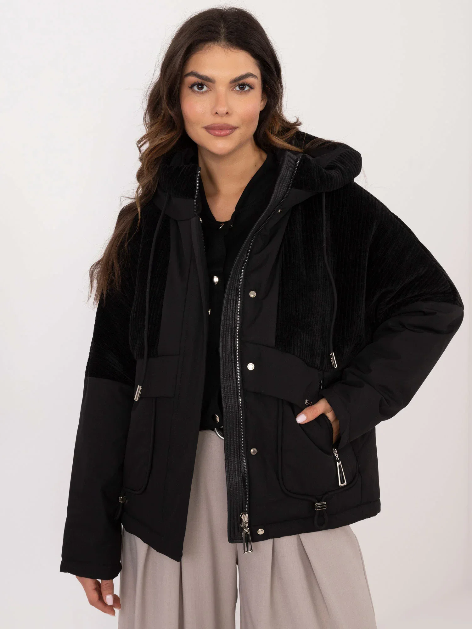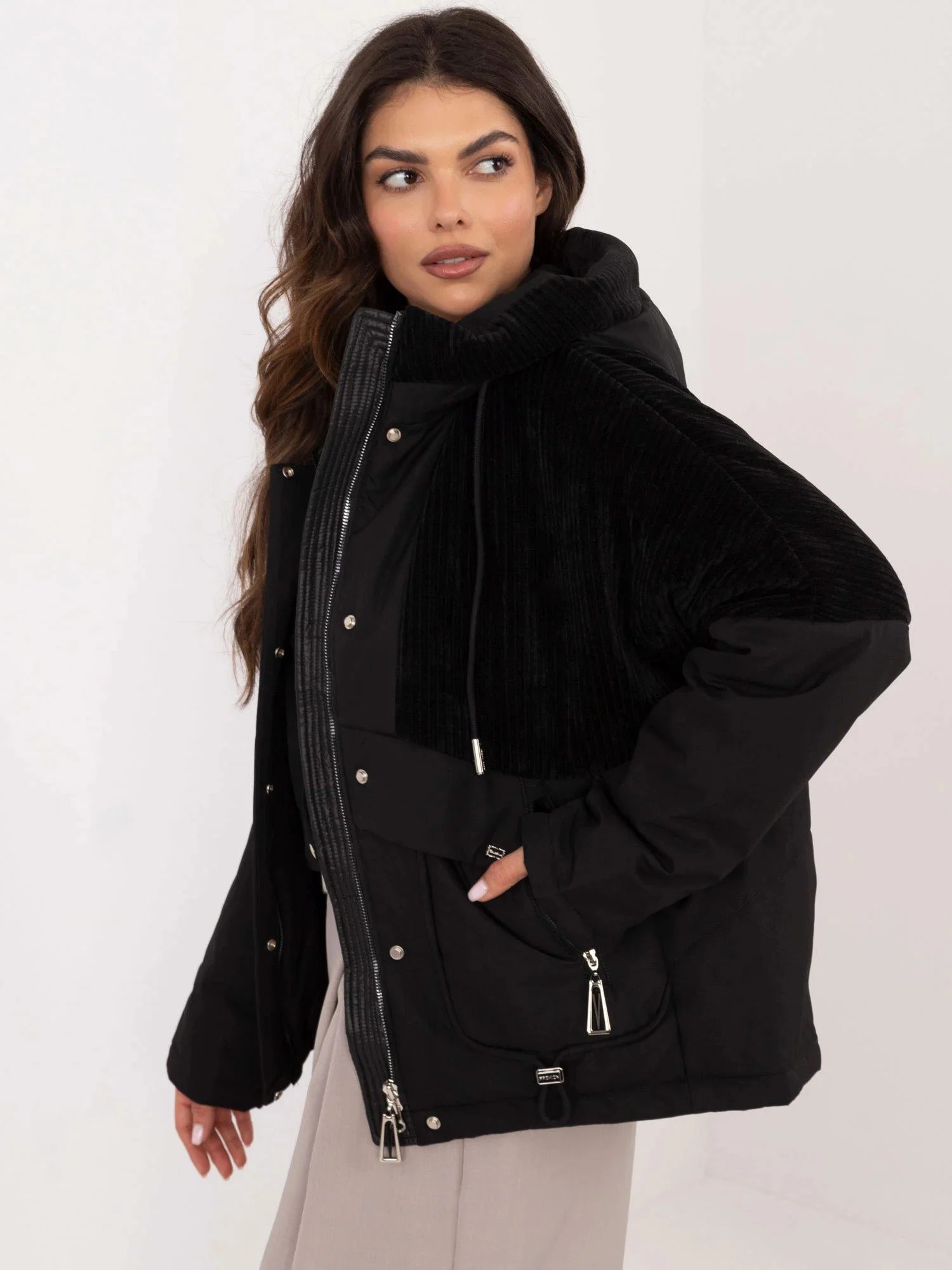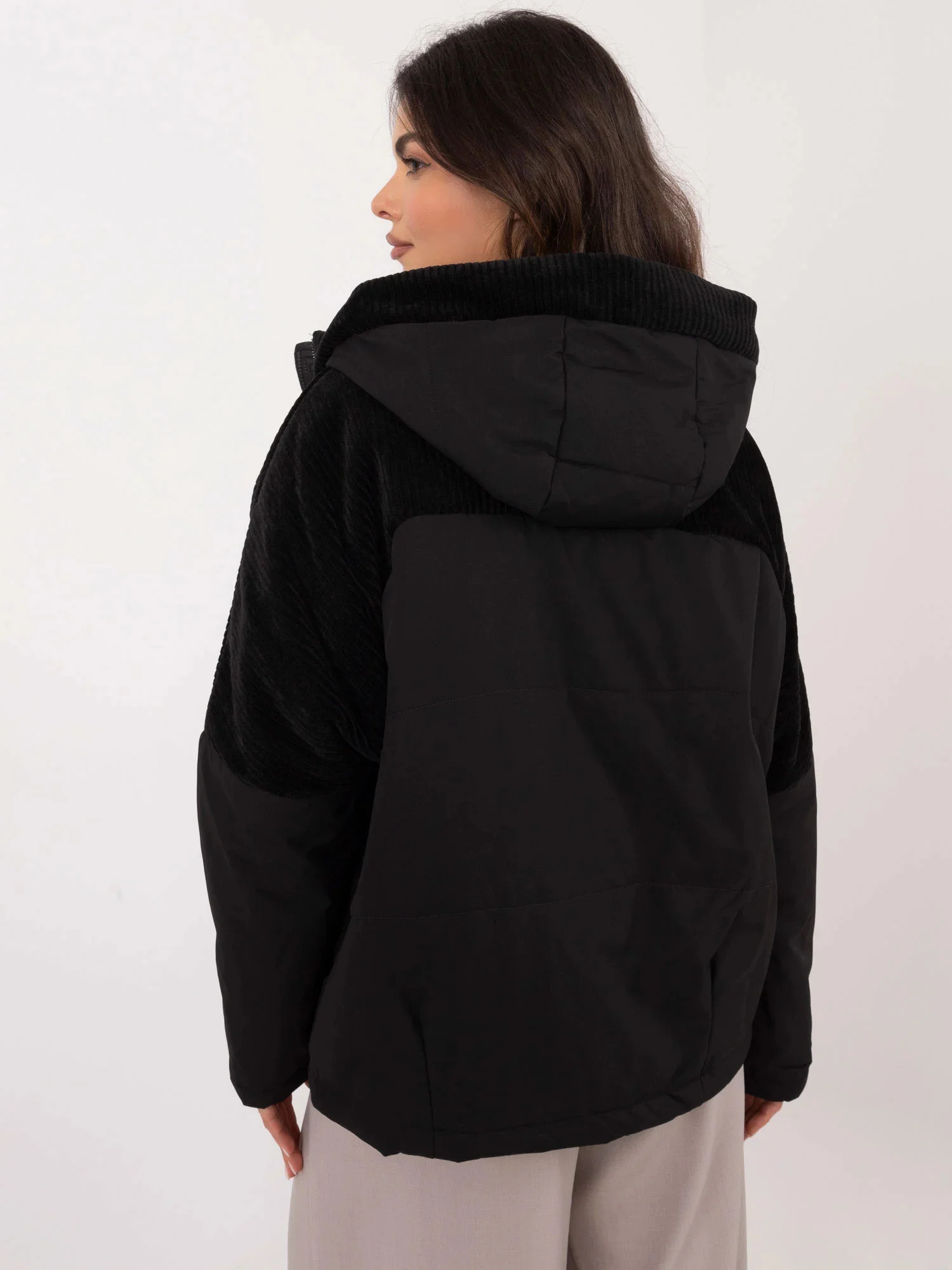 Rozměry bundy velikosti S měřené na plocho: šířka v podpaží - 58 cm, celková délka - 64 cm, délka rukávu - 59 cm.