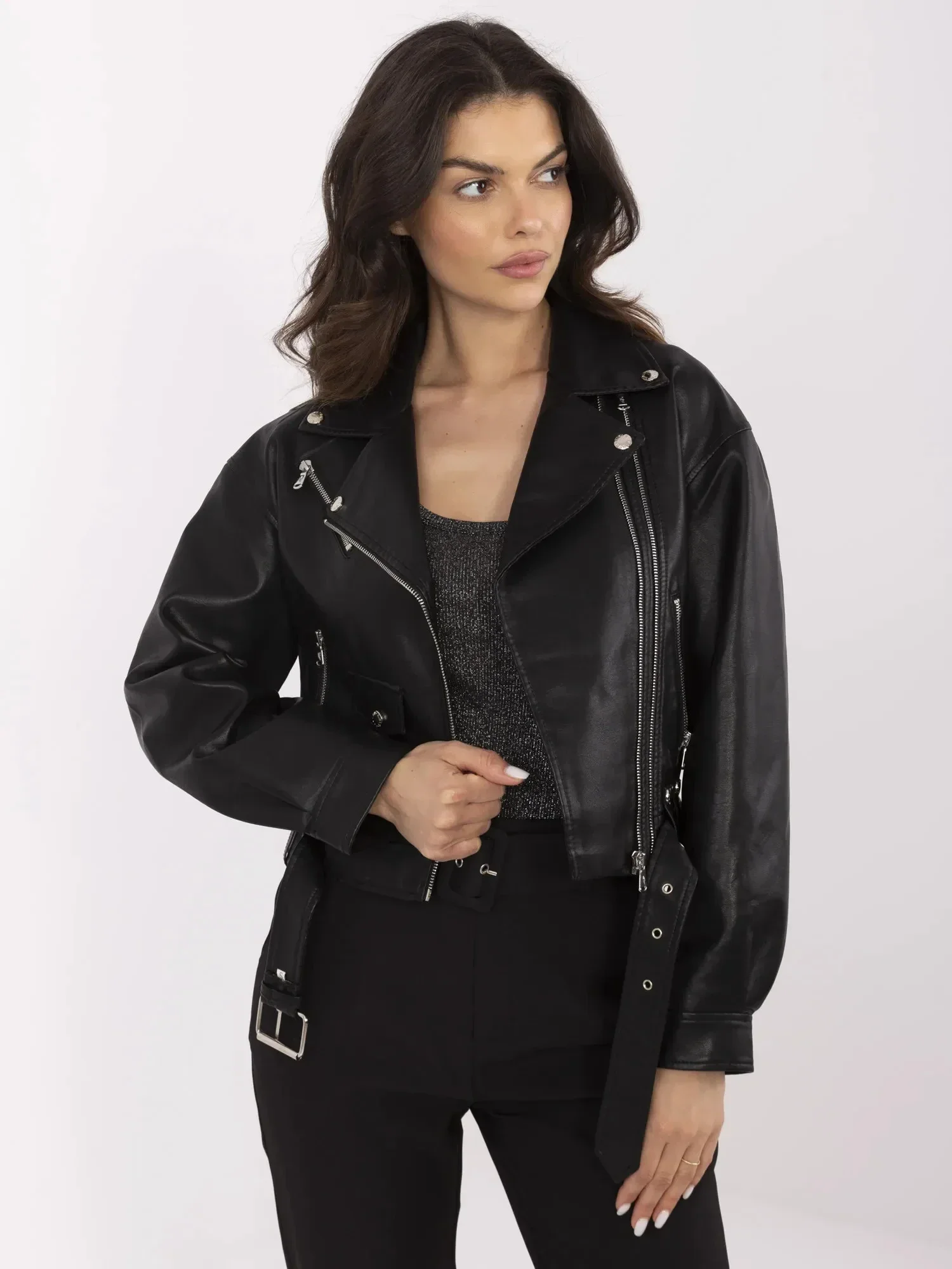 Modelka ma na sobie rozmiar S. Wymiary modelki: wzrost 173 cm, biust 85 cm, talia 62 cm, biodra 95 cm.