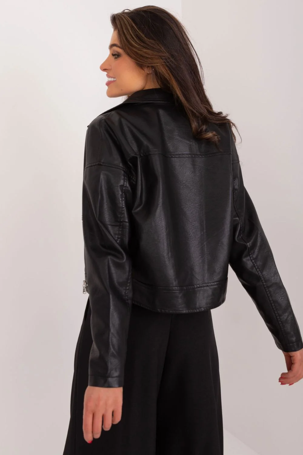 Krátká bunda ramon z ekologické kůže s dlouhými rukávy a zapínáním na zip. Bunda je podšitá, má polstrovaný límec a kapsy na zip po stranách. Návrh na jarně-letní sezónu, ideální pro mnoho příležitostí.