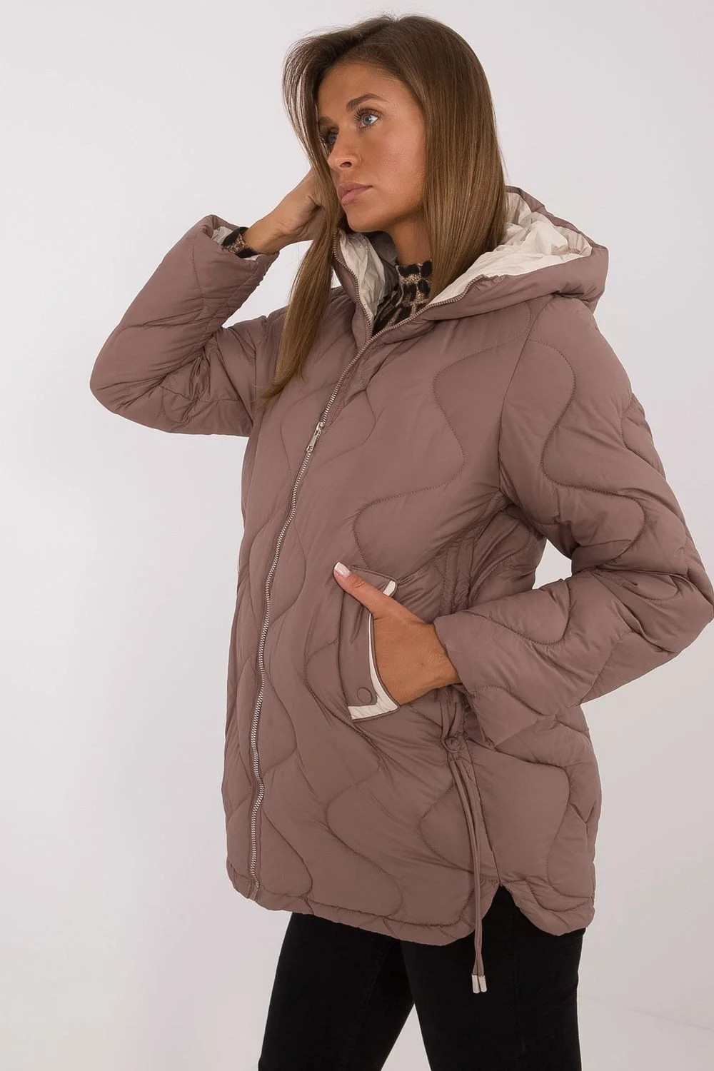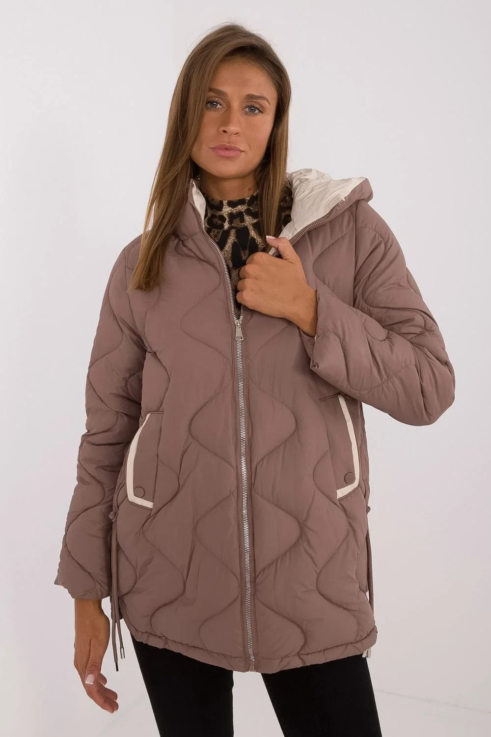 Dámská pikovaná bunda standardní délky, ideální na podzim a zimu. Vyrobená z odolného polyesteru, co zajišťuje pohodlí a ochranu před chladem. Bunda má syntetické plnění, které účinně zahřeje, zůstává však lehká a pohodlná. Je vybavena praktickou kapucí, vkládanými kapsami a dlouhým rukávem, což ji činí ideální pro každodenní, volné stylizace. Bunda má zip a podšívku, co zajišťuje dodatečnou ochranu před chladem a větrem. Je to dokonalá volba na chladné dny, kombinující styl a funkčnost.