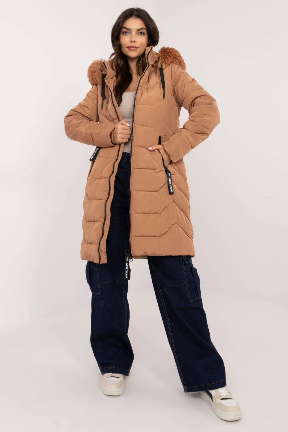 Dámská bunda s kožešinovou kapucí po kolena, ideální na podzim/zimu. Bunda má casualový, městský styl, díky čemuž se skvěle hodí do každodenních outfitů. Vyrobena z hladkého, odolného polyesteru s syntetickou výplní, poskytuje tepelný komfort a ochranu před chladem. Stehovaný vzor dodává bundě elegantní charakter, zůstává však snadno kombinovatelný s různými kousky šatníku. Model má odnímatelnou kapuci s kožešinou, co umožňuje rychlé přizpůsobení bundy podmínkám počasí. Dlouhý rukáv a zipové zapínání poskytují další ochranu před chladem, a kapsy s zipem jsou pohodlným řešením pro uložení drobností. Bundu je také vybavena vnitřní podšívkou, která zvyšuje její termoizolační vlastnosti a pohodlí nošení.