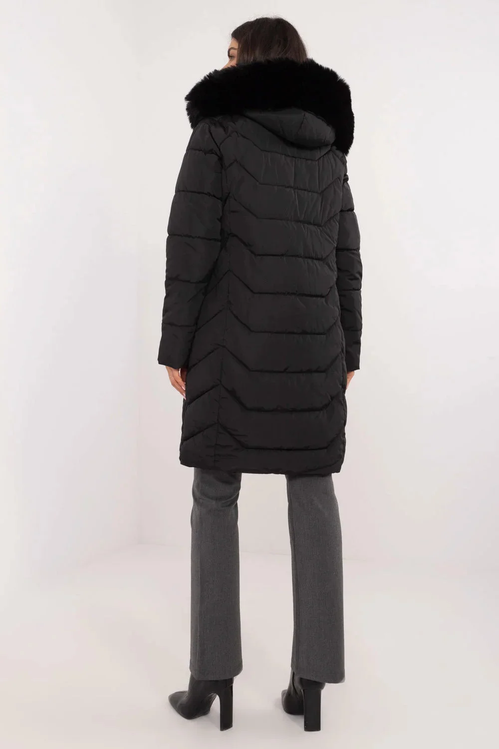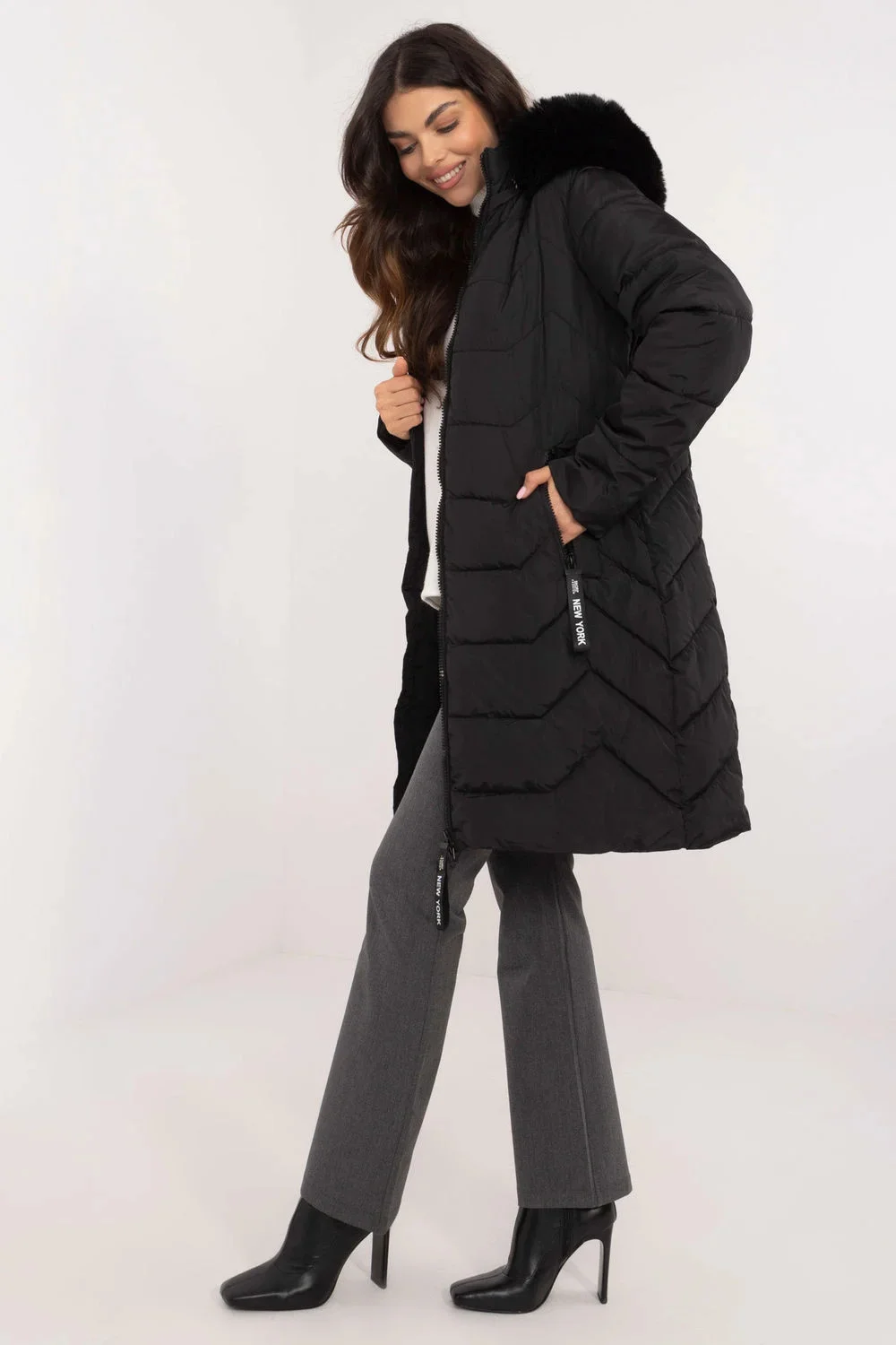Dámská bunda s náplní z peří, dlouhá po kolena, ideální na podzim/zimu. Bunda má casual, městský styl, díky čemuž se skvěle hodí do každodenních outfitů. Vyrobená z hladkého, odolného polyesteru s syntetickou náplní, poskytuje tepelný komfort a ochranu před chladem. Stepovaný vzor dodává bundě elegantní charakter, zůstává však snadno kombinovatelná s různými kousky šatníku. Model má odnímatelnou kapuci s kožešinou, co umožňuje rychle přizpůsobit bundu podmínkám počasí. Dlouhý rukáv a zipové uzavírání poskytují dodatečnou ochranu před chladem, a kapsy se zipem jsou pohodlným řešením pro uložení drobností. Bundu také doplňuje vnitřní podšívka, která zlepšuje její termoizolační vlastnosti a pohodlí nošení.