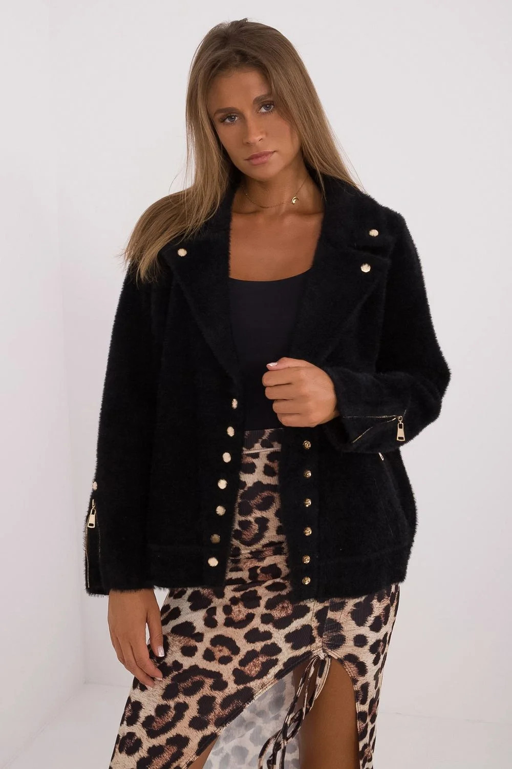 Elegantní a pohodlná dámská bunda ideální na chladnější dny. Její volný charakter jí činí skvělou volbou na každý den, spojuje styl s funkčností. Bunda je vyrobena z směsi vysoce kvalitních materiálů, jako je vlna, polyester, viskóza a angora, což zaručuje její odolnost a pohodlí při nošení. Standardní délka, ideální pro každodenní outfit. Bunda se zapíná na zip, kapsy mají zip. Rukávy jsou zdobené zipy, které jí dodávají moderní vzhled. Tato bunda je skvělou volbou pro ženy, které ocení styl a pohodlí a hledají univerzální kousek do svého šatníku na podzim a zimu.