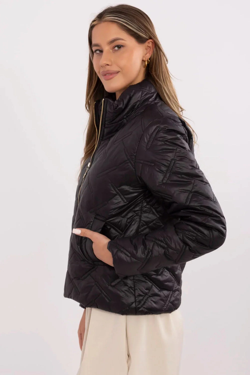 Elegantní a funkční přechodná bunda, ideální na každodenní vycházky a do práce. Vyrobená z vysoce kvalitního nylonu, poskytuje lehkost, odolnost a pohodlí při nošení. Díky pestrované struktuře získává módní charakter a hladký vzor umožňuje snadno sladit s mnoha styly. Bunda má standardní délku a klasický, ležérní střih bez kapuce. Praktické zapínání na zip umožňuje rychlé a pohodlné oblékání, a vsazené kapsy jsou funkčním doplňkem, který pojme nezbytné drobnosti. Vnitřní podšívka zvyšuje tepelný komfort v chladnějších dnech. Univerzální volba na jaro a podzim pro ženy, které si cení pohodlí a nadčasový styl.