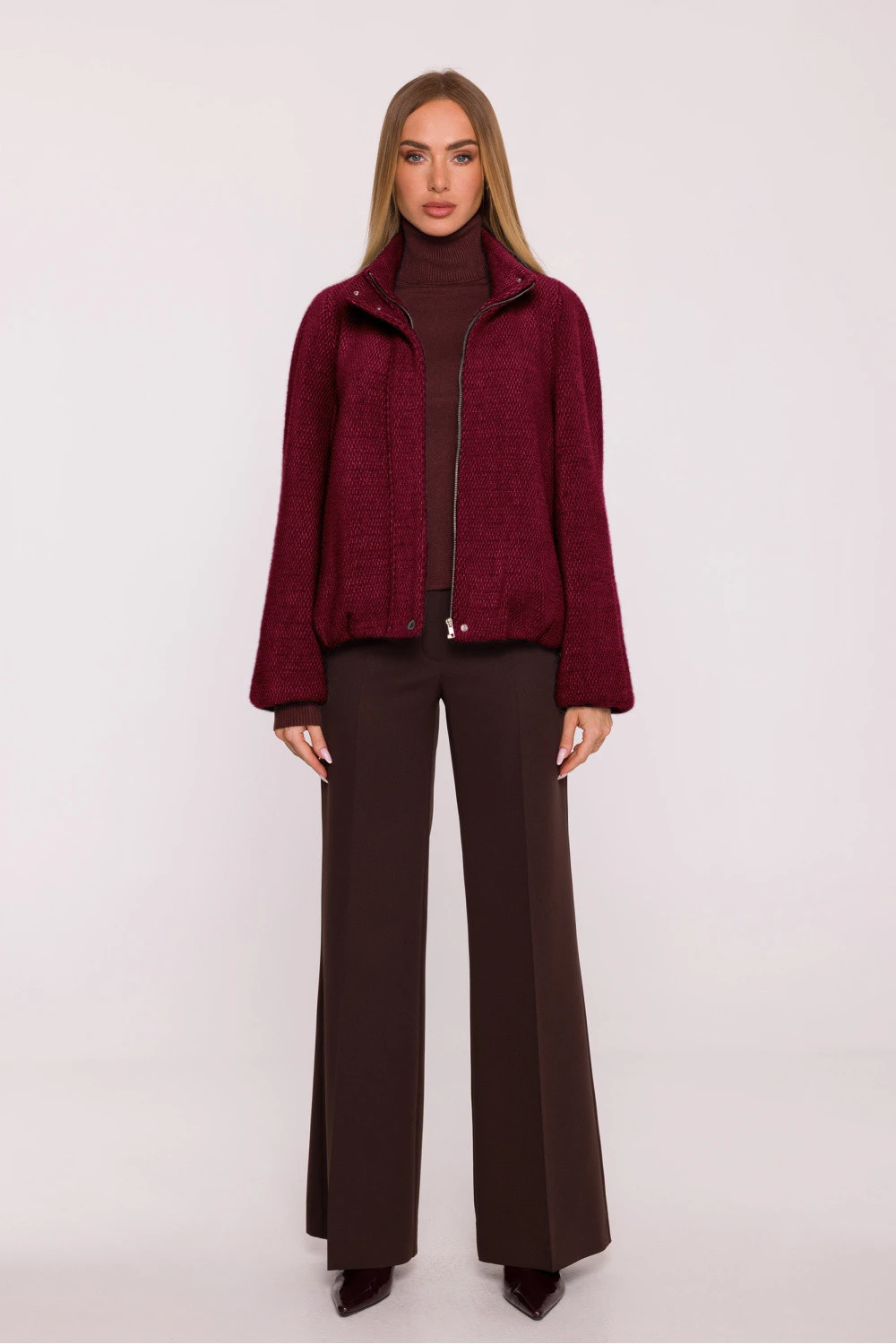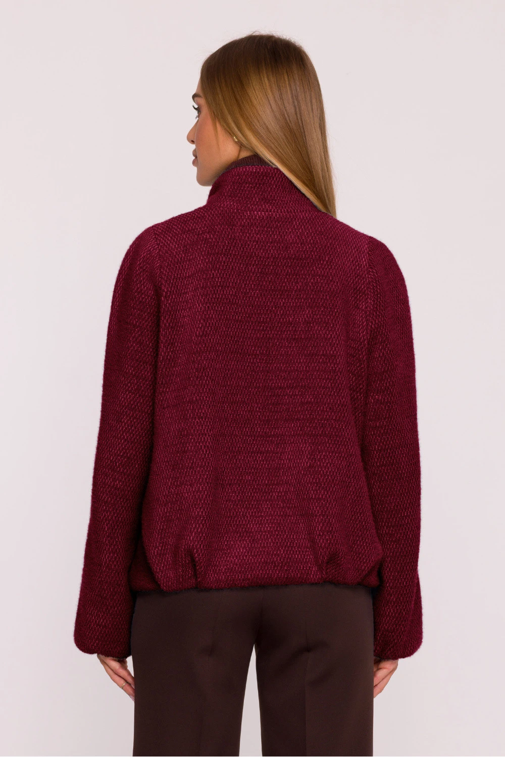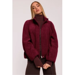 Elegantní dámská bunda vyrobená z měkké pleteniny s krátkým vlasem je návrh, který kombinuje pohodlí a moderní charakter. Celý kousek je vybaven podšívkou, díky čemuž se bunda skvěle tvaruje a zajišťuje pohodlí při nošení. Model je vybaven praktickým stojánkem a zipem, doplněnými knoflíky umístěnými v dolní části plisovaného lemu a u límce. Široké, dlouhé rukávy s reglanovým střihem dodávají postavě lehkost a volnost, a vsunuté boční kapsy přidávají funkcionalitu. Bundu má volný, uvolněný střih v lehce oversized stylu, jemně se přizpůsobující postavě. Její délka sahá až po linii boků, což z ní činí ideální doplněk jak k džínám, tak k elegantnějším stylizacím. Navržena a ušita v Polsku, představuje výjimečné spojení kvality, pohodlí a moderního designu.